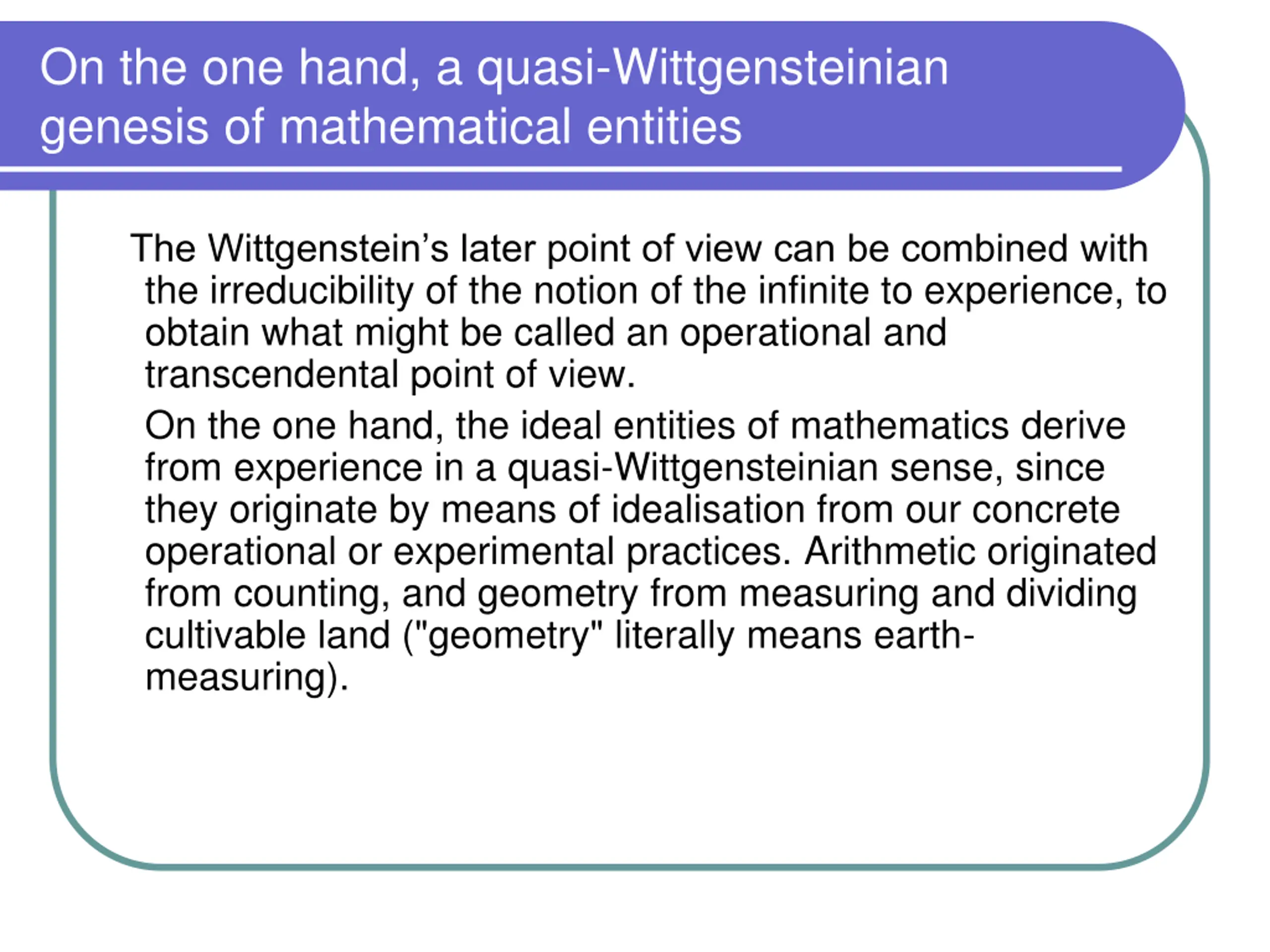 On the one hand, a quasi-Wittgensteinian genesis of mathematical entities The Wittgenstein s later point of view can be combined with the irreducibility of the notion of the infinite to experience, to obtain what might be called an operational and transcendental point of view. On the one hand, the ideal entities of mathematics derive from experience in a quasi-Wittgensteinian sense, since they originate by means of idealisation from our concrete operational or experimental practices. Arithmetic originated from counting, and geometry from measuring and dividing cultivable land ("geometry" literally means earth- measuring).