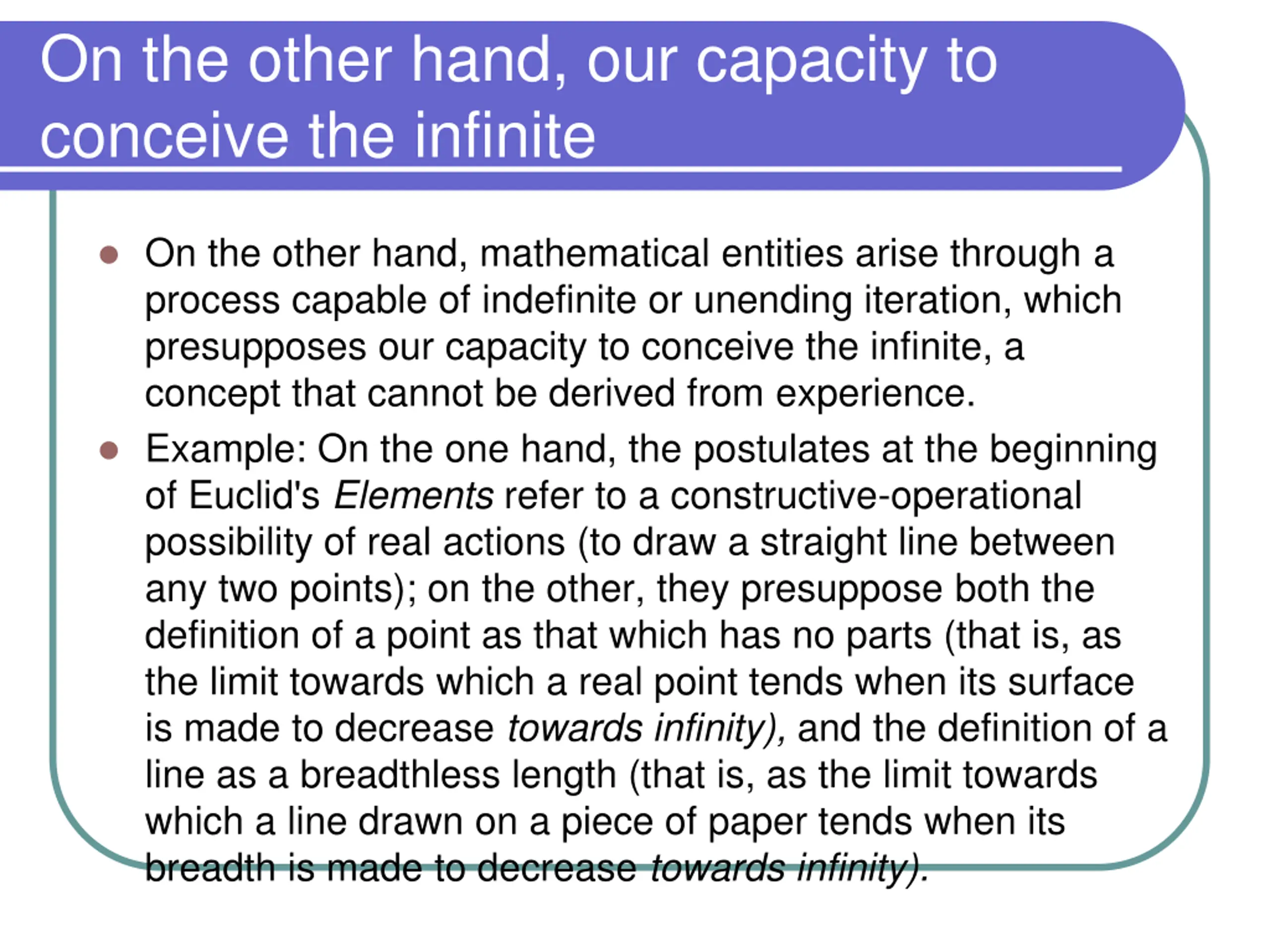 On the other hand, our capacity to conceive the infinite On the other hand, mathematical entities arise through a process capable of indefinite or unending iteration, which presupposes our capacity to conceive the infinite, a concept that cannot be derived from experience. Example: On the one hand, the postulates at the beginning of Euclid's Elements refer to a constructive-operational possibility of real actions (to draw a straight line between any two points); on the other, they presuppose both the definition of a point as that which has no parts (that is, as the limit towards which a real point tends when its surface is made to decrease towards infinity), and the definition of a line as a breadthless length (that is, as the limit towards which a line drawn on a piece of paper tends when its breadth is made to decrease towards infinity).