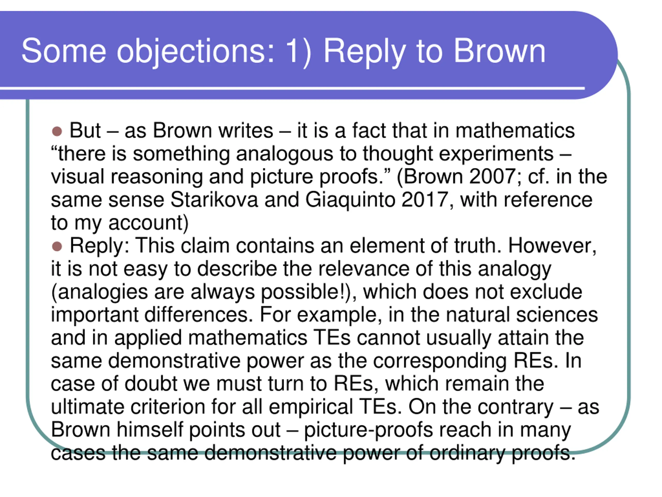 Some objections: 1) Reply to Brown But as Brown writes it is a fact that in mathematics there is something analogous to thought experiments visual reasoning and picture proofs. (Brown 2007; cf. in the same sense Starikova and Giaquinto 2017, with reference to my account) Reply: This claim contains an element of truth. However, it is not easy to describe the relevance of this analogy (analogies are always possible!), which does not exclude important differences. For example, in the natural sciences and in applied mathematics TEs cannot usually attain the same demonstrative power as the corresponding REs. In case of doubt we must turn to REs, which remain the ultimate criterion for all empirical TEs. On the contrary as Brown himself points out picture-proofs reach in many cases the same demonstrative power of ordinary proofs.