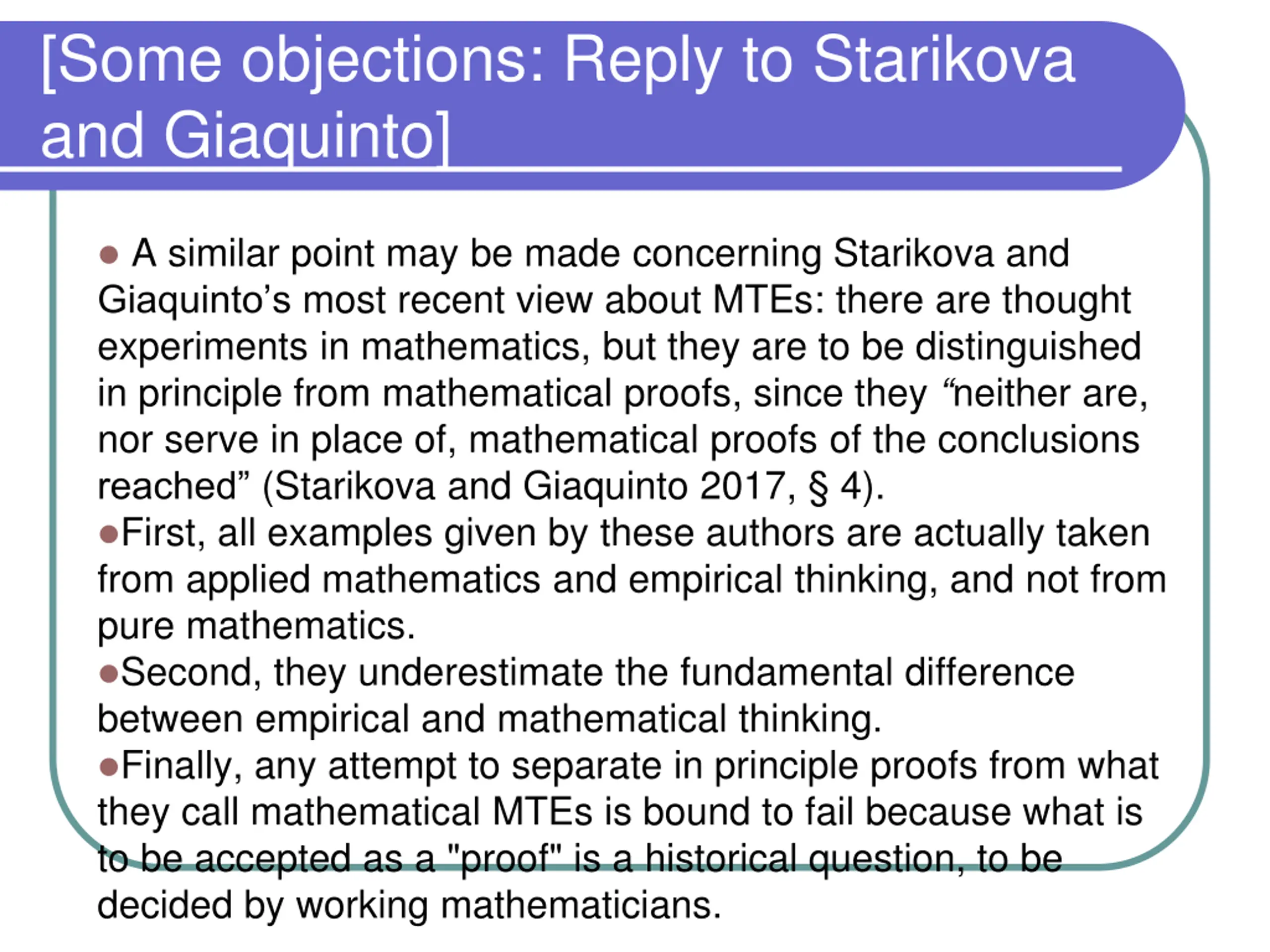 [Some objections: Reply to Starikova and Giaquinto] A similar point may be made concerning Starikova and Giaquinto s most recent view about MTEs: there are thought experiments in mathematics, but they are to be distinguished in principle from mathematical proofs, since they neither are, nor serve in place of, mathematical proofs of the conclusions reached (Starikova and Giaquinto 2017, 4). First, all examples given by these authors are actually taken from applied mathematics and empirical thinking, and not from pure mathematics. Second, they underestimate the fundamental difference between empirical and mathematical thinking. Finally, any attempt to separate in principle proofs from what they call mathematical MTEs is bound to fail because what is to be accepted as a "proof" is a historical question, to be decided by working mathematicians.