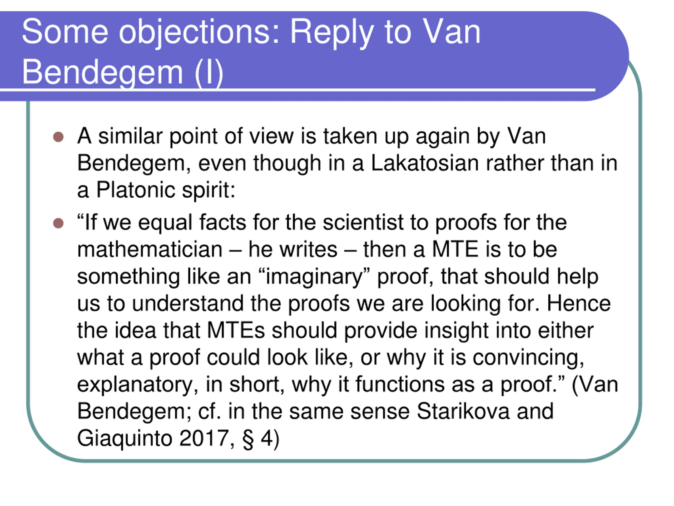Some objections: Reply to Van Bendegem (I) A similar point of view is taken up again by Van Bendegem, even though in a Lakatosian rather than in a Platonic spirit: If we equal facts for the scientist to proofs for the mathematician he writes then a MTE is to be something like an imaginary proof, that should help us to understand the proofs we are looking for. Hence the idea that MTEs should provide insight into either what a proof could look like, or why it is convincing, explanatory, in short, why it functions as a proof. (Van Bendegem; cf. in the same sense Starikova and Giaquinto 2017, 4)