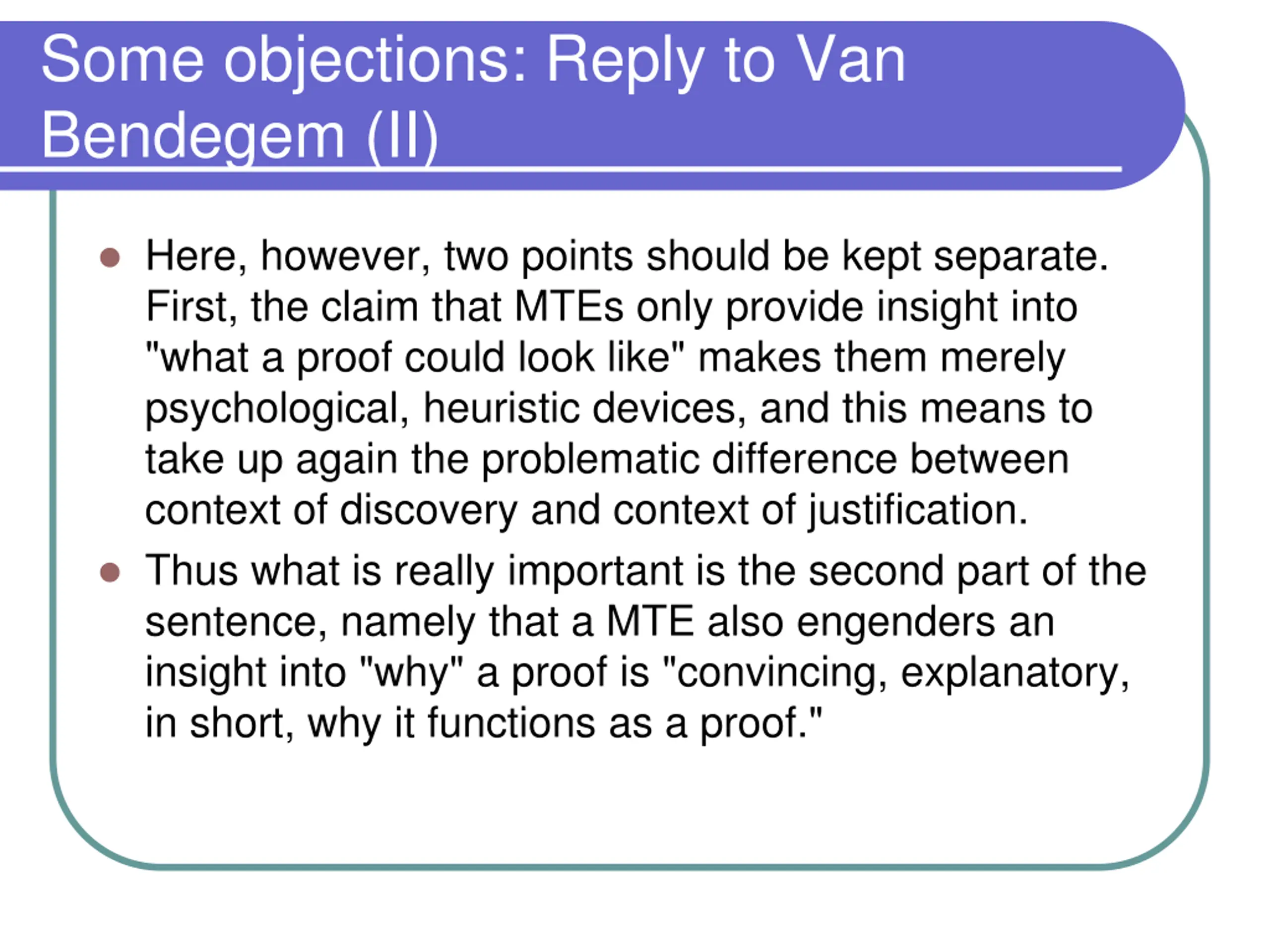 Some objections: Reply to Van Bendegem (II) Here, however, two points should be kept separate. First, the claim that MTEs only provide insight into "what a proof could look like" makes them merely psychological, heuristic devices, and this means to take up again the problematic difference between context of discovery and context of justification. Thus what is really important is the second part of the sentence, namely that a MTE also engenders an insight into "why" a proof is "convincing, explanatory, in short, why it functions as a proof."