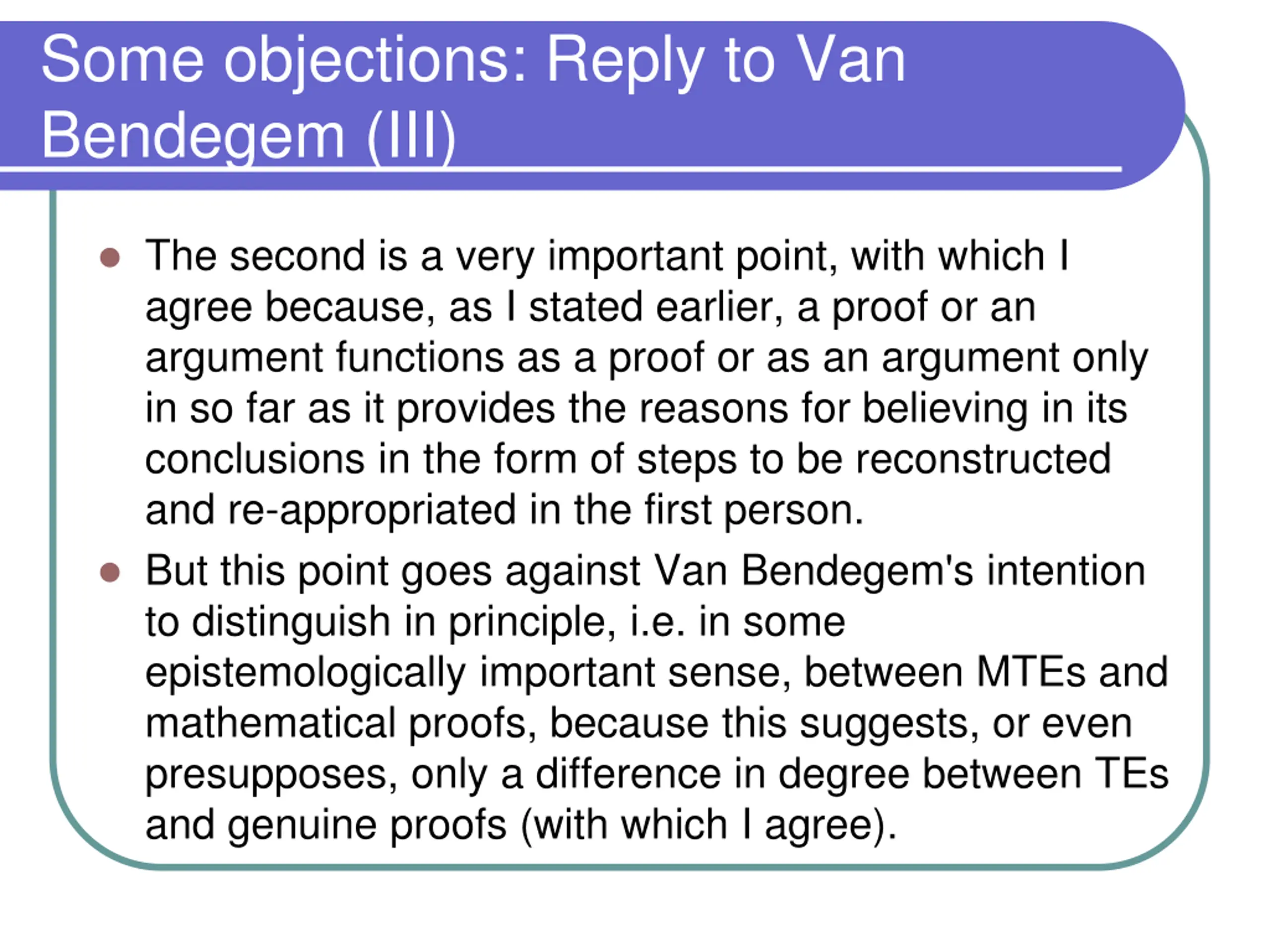 Some objections: Reply to Van Bendegem (III) The second is a very important point, with which I agree because, as I stated earlier, a proof or an argument functions as a proof or as an argument only in so far as it provides the reasons for believing in its conclusions in the form of steps to be reconstructed and re-appropriated in the first person. But this point goes against Van Bendegem's intention to distinguish in principle, i.e. in some epistemologically important sense, between MTEs and mathematical proofs, because this suggests, or even presupposes, only a difference in degree between TEs and genuine proofs (with which I agree).