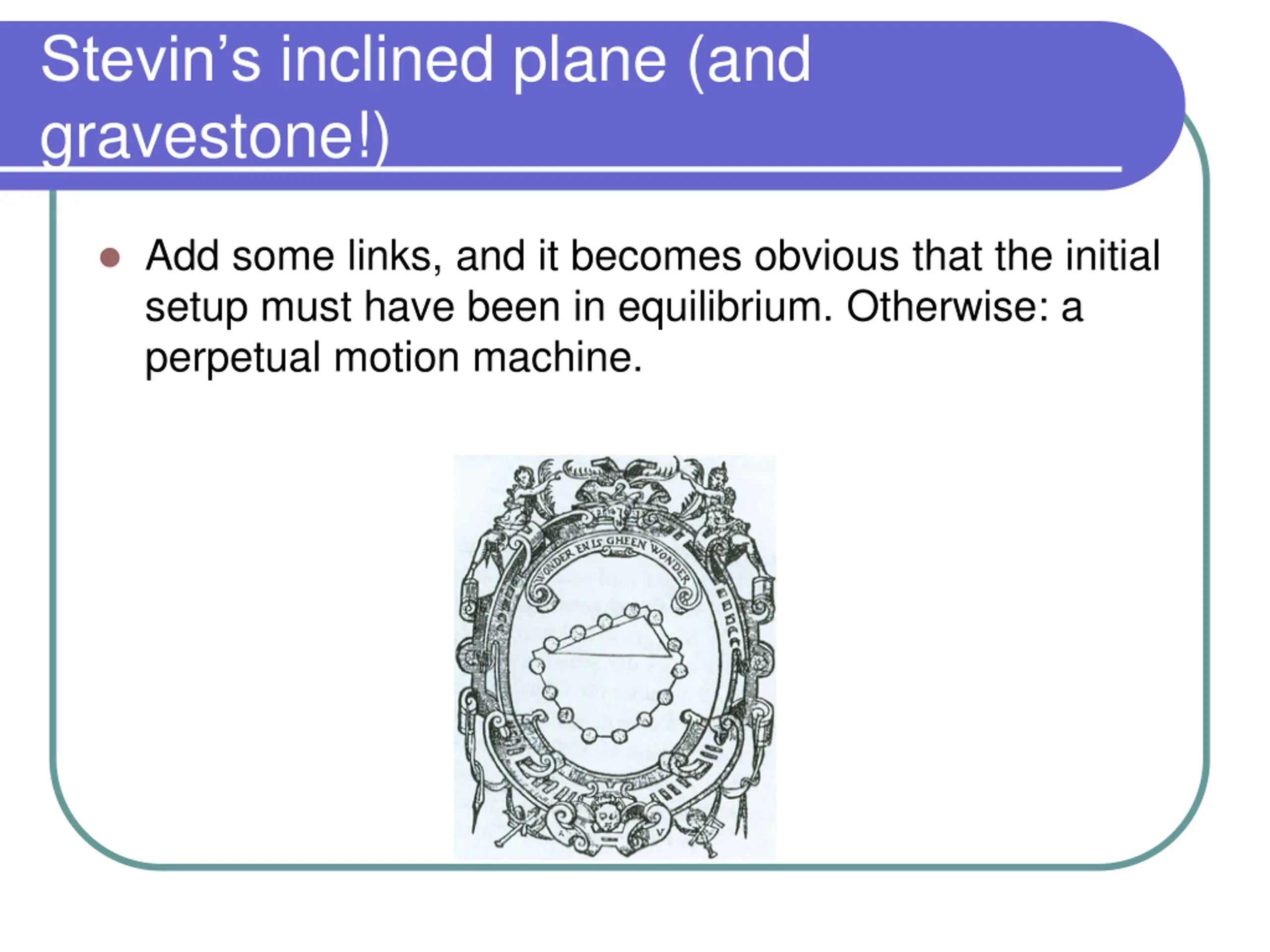 Stevins inclined plane (and gravestone!) Add some links, and it becomes obvious that the initial setup must have been in equilibrium. Otherwise: a perpetual motion machine.
