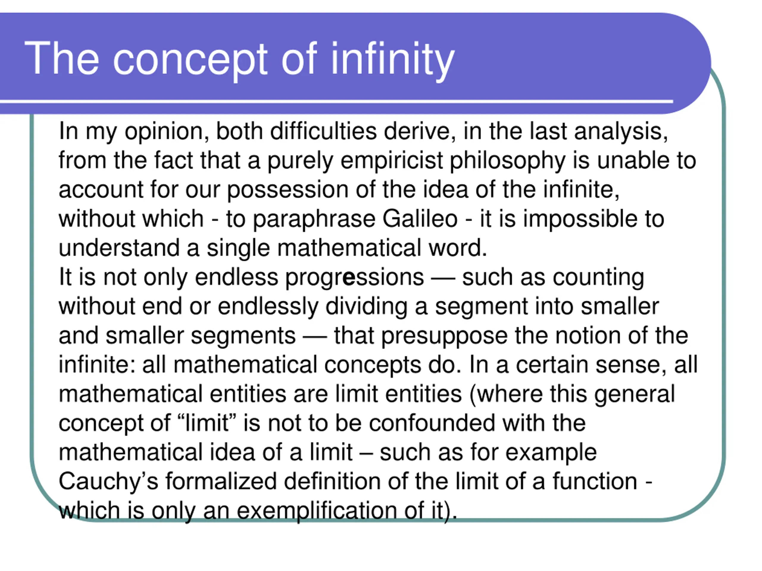 The concept of infinity In my opinion, both difficulties derive, in the last analysis, from the fact that a purely empiricist philosophy is unable to account for our possession of the idea of the infinite, without which - to paraphrase Galileo - it is impossible to understand a single mathematical word. It is not only endless progressions such as counting without end or endlessly dividing a segment into smaller and smaller segments that presuppose the notion of the infinite: all mathematical concepts do. In a certain sense, all mathematical entities are limit entities (where this general concept of limit is not to be confounded with the mathematical idea of a limit such as for example Cauchy s formalized definition of the limit of a function - which is only an exemplification of it).
