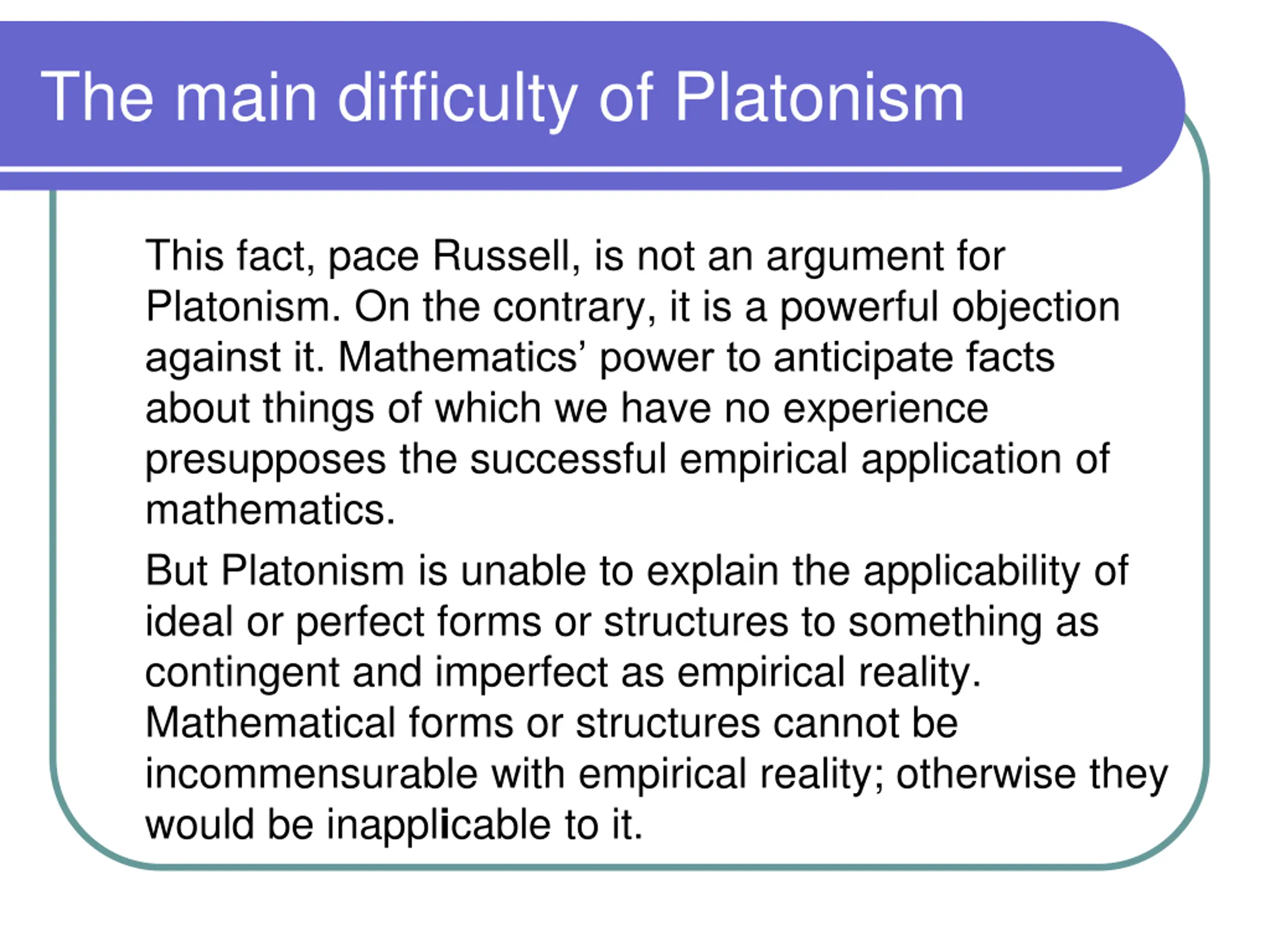 The main difficulty of Platonism This fact, pace Russell, is not an argument for Platonism. On the contrary, it is a powerful objection against it. Mathematics power to anticipate facts about things of which we have no experience presupposes the successful empirical application of mathematics. But Platonism is unable to explain the applicability of ideal or perfect forms or structures to something as contingent and imperfect as empirical reality. Mathematical forms or structures cannot be incommensurable with empirical reality; otherwise they would be inapplicable to it.