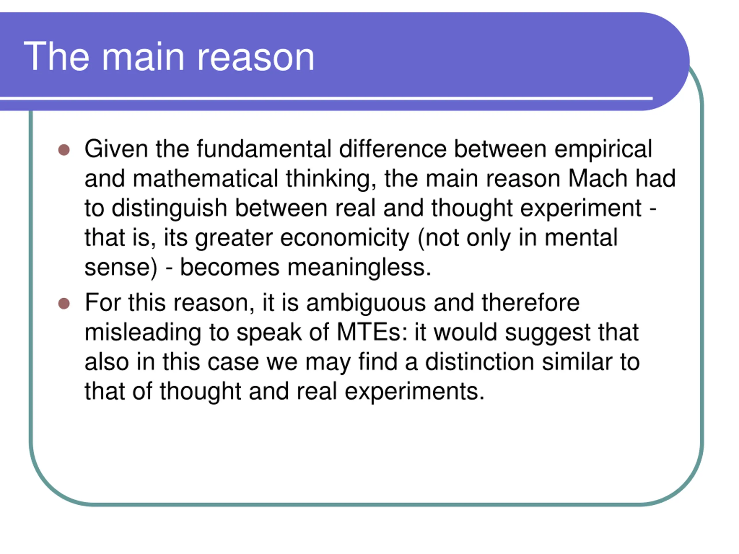 The main reason Given the fundamental difference between empirical and mathematical thinking, the main reason Mach had to distinguish between real and thought experiment - that is, its greater economicity (not only in mental sense) - becomes meaningless. For this reason, it is ambiguous and therefore misleading to speak of MTEs: it would suggest that also in this case we may find a distinction similar to that of thought and real experiments.