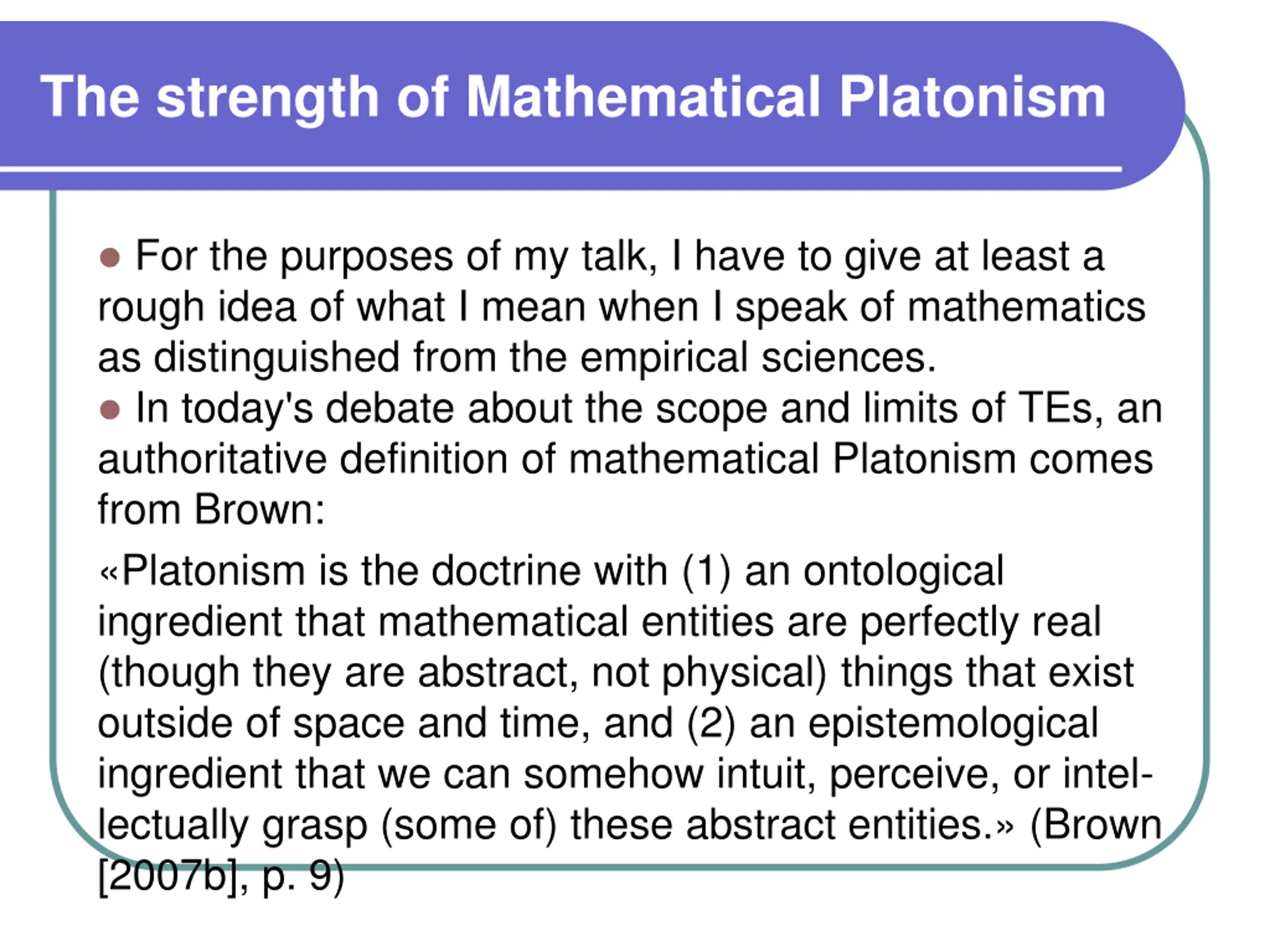 The strength of Mathematical Platonism For the purposes of my talk, I have to give at least a rough idea of what I mean when I speak of mathematics as distinguished from the empirical sciences. In today's debate about the scope and limits of TEs, an authoritative definition of mathematical Platonism comes from Brown: Platonism is the doctrine with (1) an ontological ingredient that mathematical entities are perfectly real (though they are abstract, not physical) things that exist outside of space and time, and (2) an epistemological ingredient that we can somehow intuit, perceive, or intel- lectually grasp (some of) these abstract entities. (Brown [2007b], p. 9)