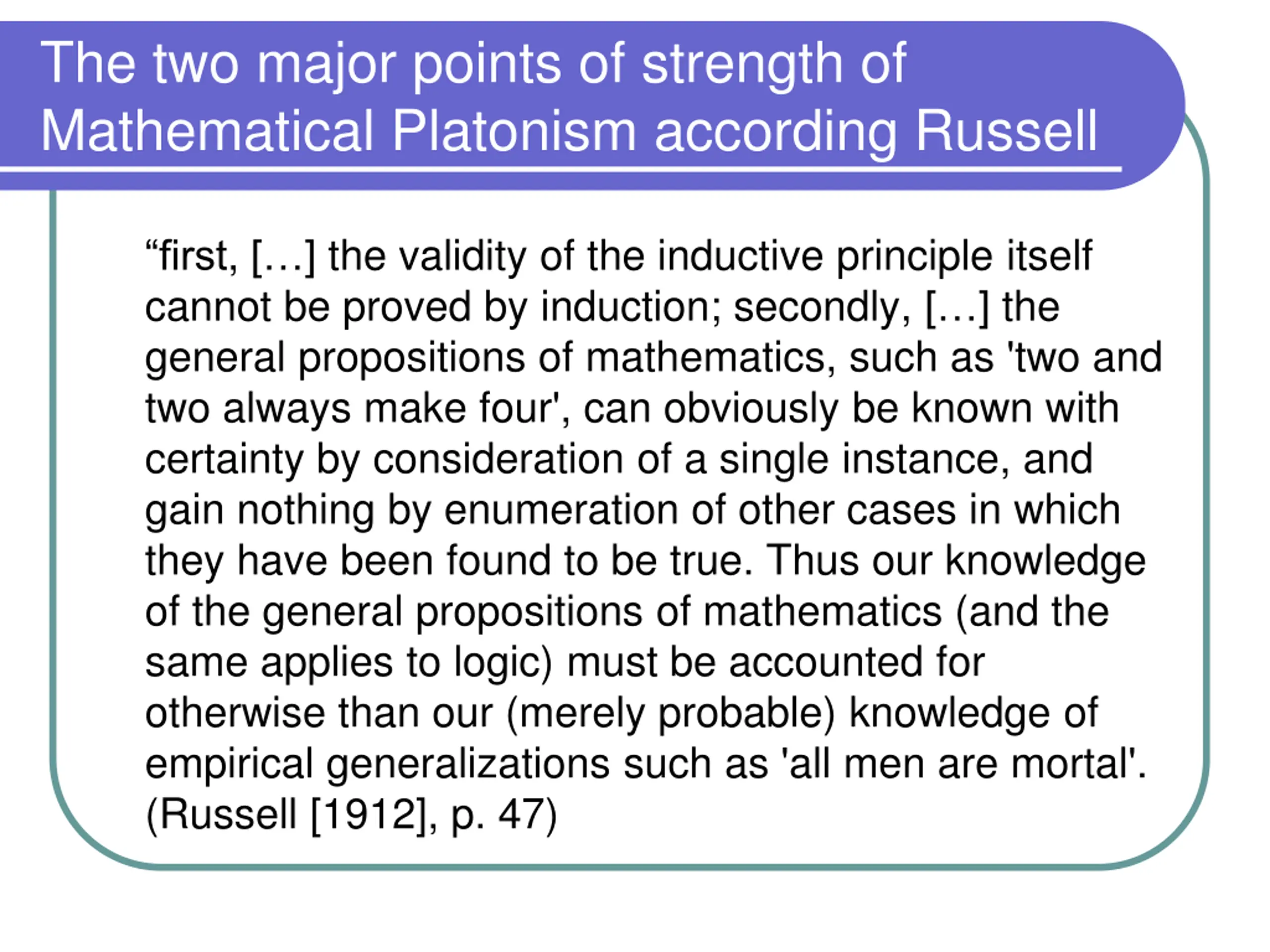 The two major points of strength of Mathematical Platonism according Russell first, [ ] the validity of the inductive principle itself cannot be proved by induction; secondly, [ ] the general propositions of mathematics, such as 'two and two always make four', can obviously be known with certainty by consideration of a single instance, and gain nothing by enumeration of other cases in which they have been found to be true. Thus our knowledge of the general propositions of mathematics (and the same applies to logic) must be accounted for otherwise than our (merely probable) knowledge of empirical generalizations such as 'all men are mortal'. (Russell [1912], p. 47)