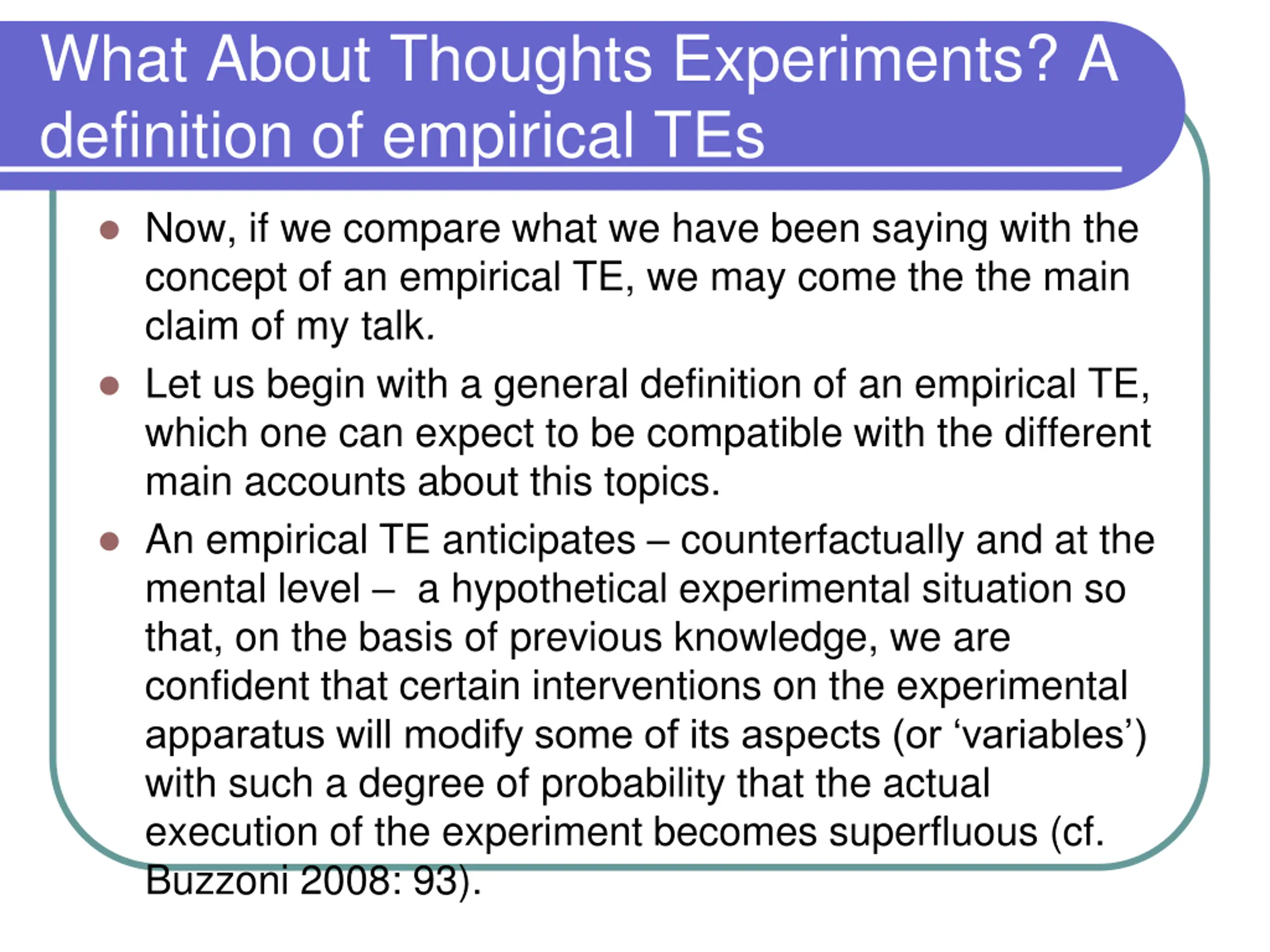 What About Thoughts Experiments? A definition of empirical TEs Now, if we compare what we have been saying with the concept of an empirical TE, we may come the the main claim of my talk. Let us begin with a general definition of an empirical TE, which one can expect to be compatible with the different main accounts about this topics. An empirical TE anticipates counterfactually and at the mental level a hypothetical experimental situation so that, on the basis of previous knowledge, we are confident that certain interventions on the experimental apparatus will modify some of its aspects (or variables ) with such a degree of probability that the actual execution of the experiment becomes superfluous (cf. Buzzoni 2008: 93).