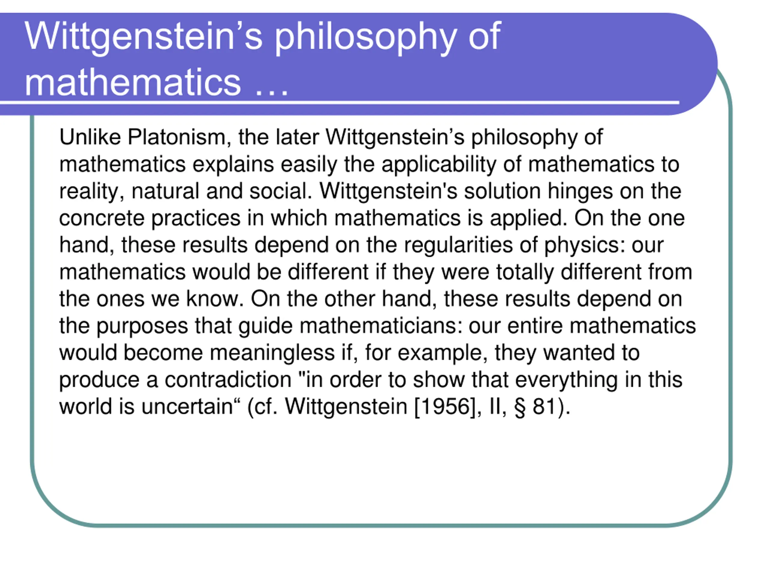Wittgensteins philosophy of mathematics Unlike Platonism, the later Wittgenstein s philosophy of mathematics explains easily the applicability of mathematics to reality, natural and social. Wittgenstein's solution hinges on the concrete practices in which mathematics is applied. On the one hand, these results depend on the regularities of physics: our mathematics would be different if they were totally different from the ones we know. On the other hand, these results depend on the purposes that guide mathematicians: our entire mathematics would become meaningless if, for example, they wanted to produce a contradiction "in order to show that everything in this world is uncertain (cf. Wittgenstein [1956], II, 81).
