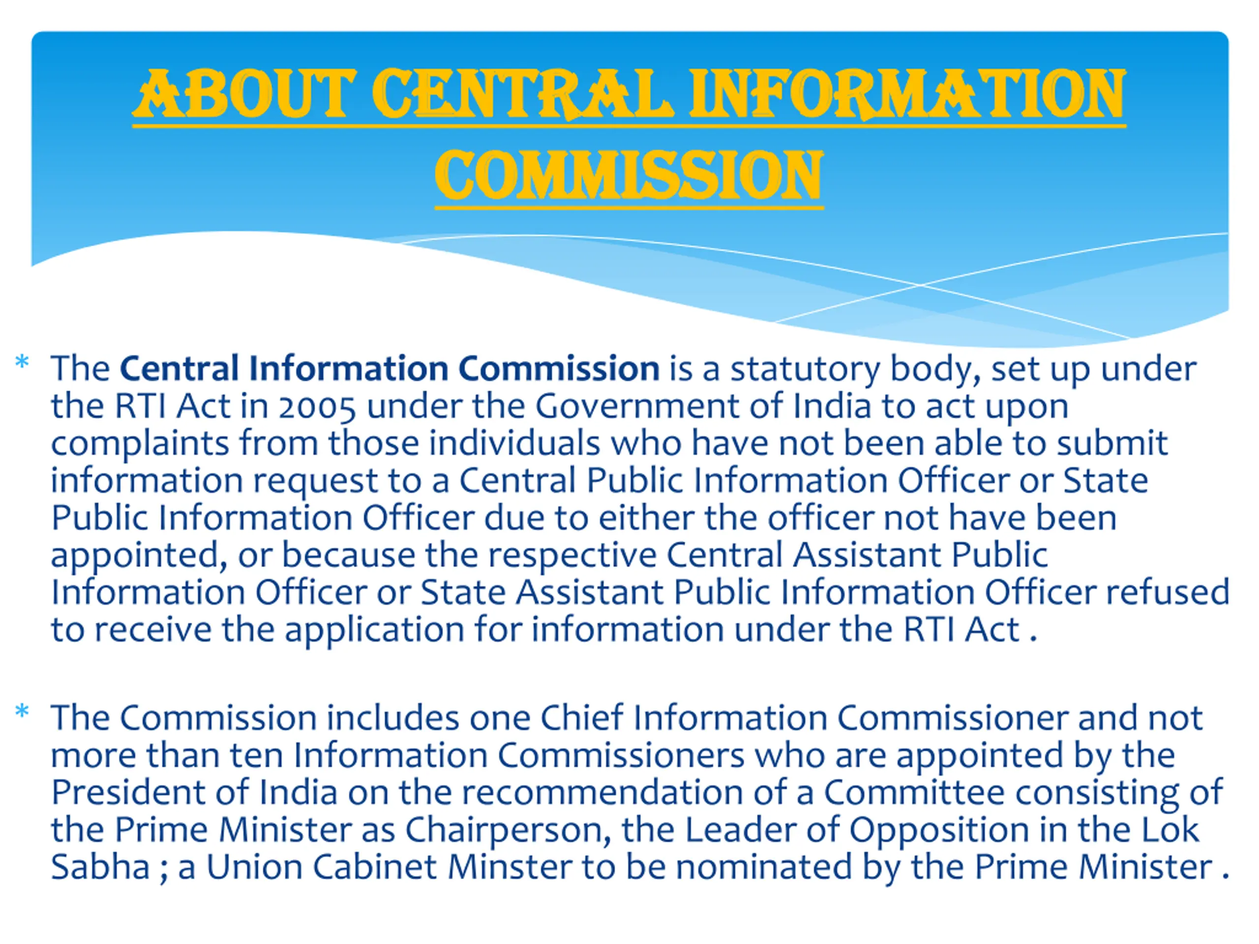About Central Information About Central Information Commission Commission * The Central Information Commission is a statutory body, set up under the RTI Act in 2005 under the Government of India to act upon complaints from those individuals who have not been able to submit information request to a Central Public Information Officer or State Public Information Officer due to either the officer not have been appointed, or because the respective Central Assistant Public Information Officer or State Assistant Public Information Officer refused to receive the application for information under the RTI Act . * The Commission includes one Chief Information Commissioner and not more than ten Information Commissioners who are appointed by the President of India on the recommendation of a Committee consisting of the Prime Minister as Chairperson, the Leader of Opposition in the Lok Sabha ; a Union Cabinet Minster to be nominated by the Prime Minister .