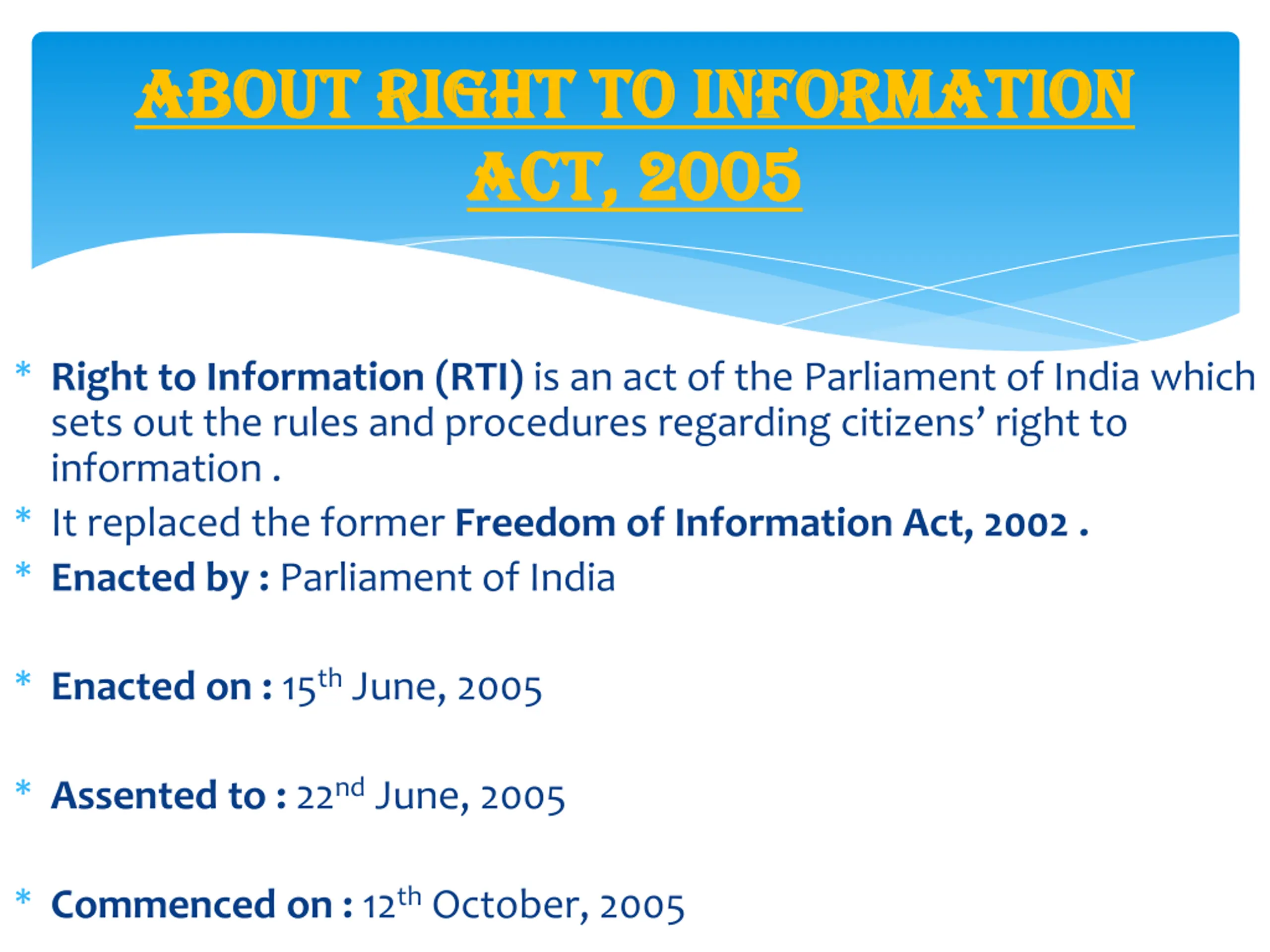 About right to information About right to information act, 2005 act, 2005 * Right to Information (RTI) is an act of the Parliament of India which sets out the rules and procedures regarding citizens right to information . * It replaced the former Freedom of Information Act, 2002 . * Enacted by : Parliament of India * Enacted on : 15thJune, 2005 * Assented to : 22ndJune, 2005 * Commenced on : 12thOctober, 2005