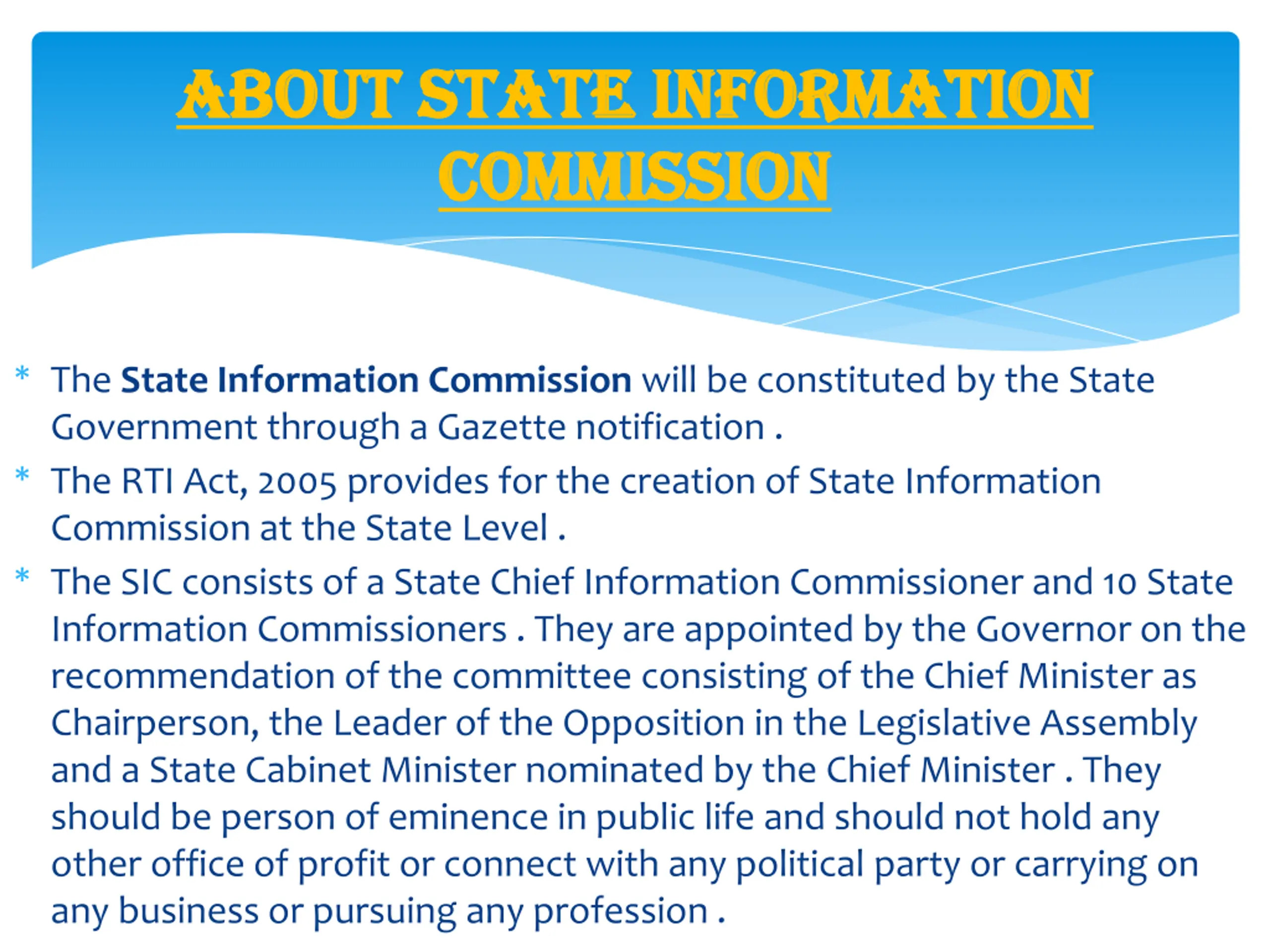 About state information About state information commission commission * The State Information Commission will be constituted by the State Government through a Gazette notification . * The RTI Act, 2005 provides for the creation of State Information Commission at the State Level . * The SIC consists of a State Chief Information Commissioner and 10 State Information Commissioners . They are appointed by the Governor on the recommendation of the committee consisting of the Chief Minister as Chairperson, the Leader of the Opposition in the Legislative Assembly and a State Cabinet Minister nominated by the Chief Minister . They should be person of eminence in public life and should not hold any other office of profit or connect with any political party or carrying on any business or pursuing any profession .