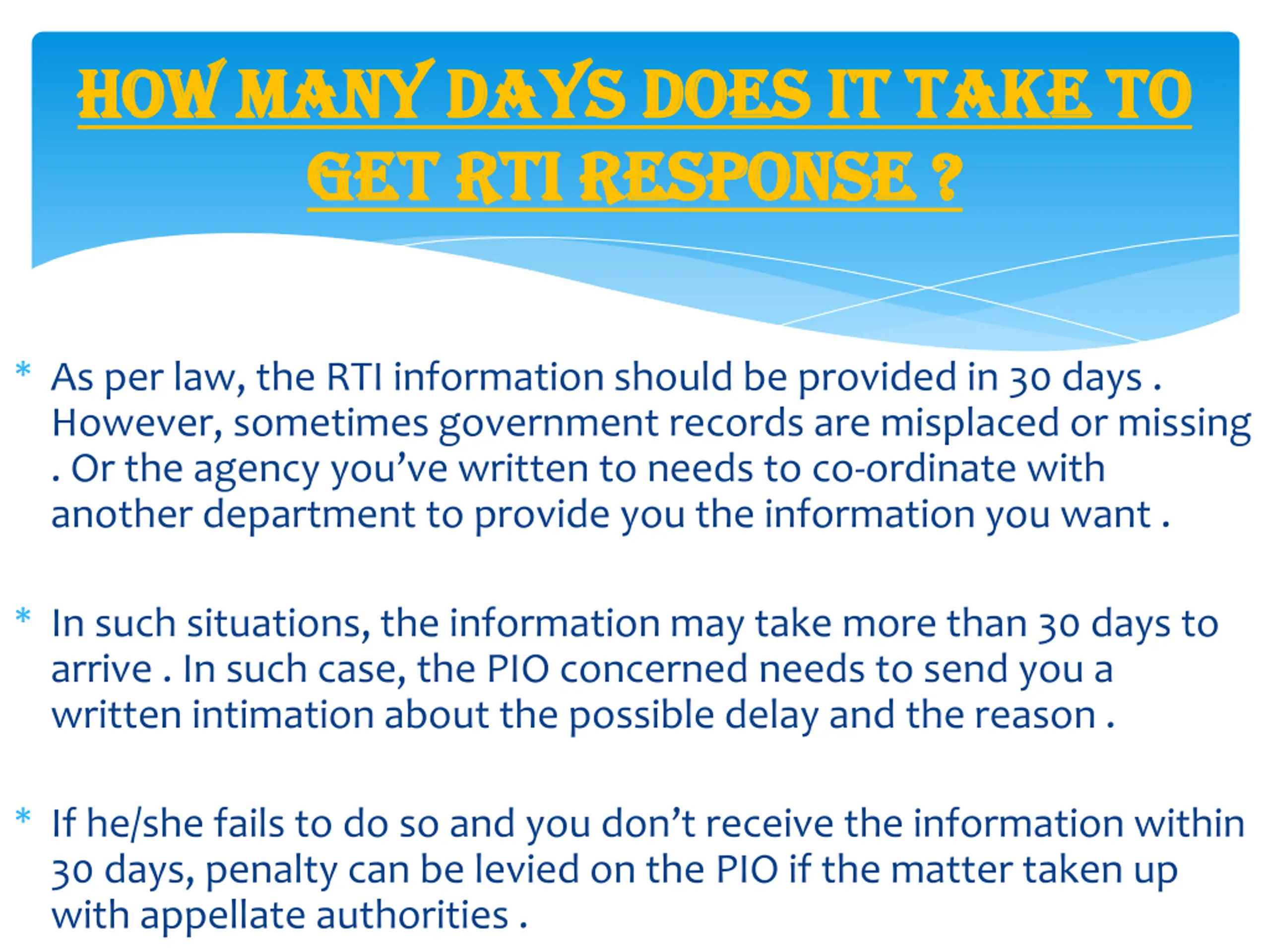 How many days does it take to How many days does it take to get rti response ? get rti response ? * As per law, the RTI information should be provided in 30 days . However, sometimes government records are misplaced or missing . Or the agency you ve written to needs to co-ordinate with another department to provide you the information you want . * In such situations, the information may take more than 30 days to arrive . In such case, the PIO concerned needs to send you a written intimation about the possible delay and the reason . * If he/she fails to do so and you don t receive the information within 30 days, penalty can be levied on the PIO if the matter taken up with appellate authorities .