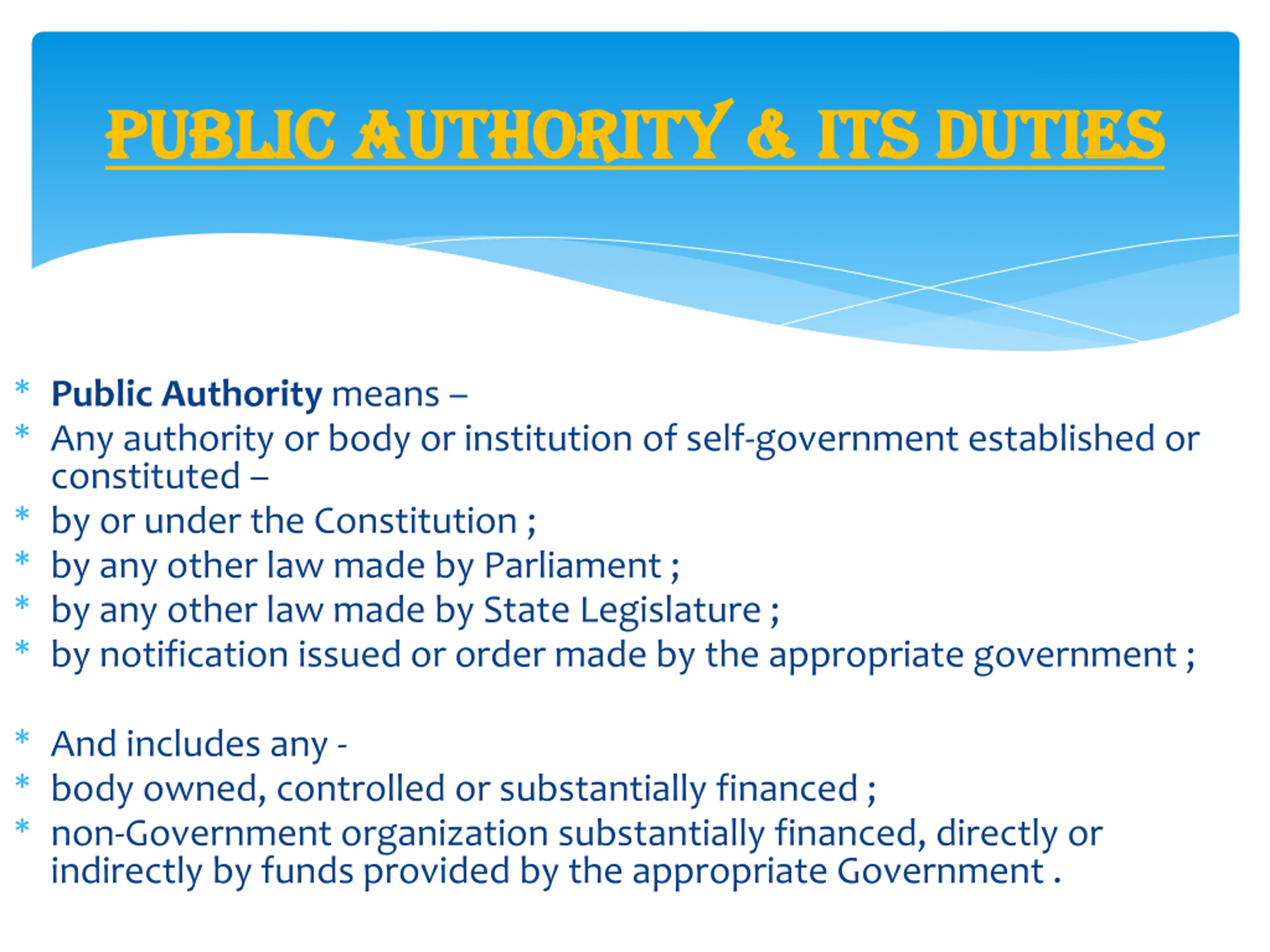 Public authority & its duties Public authority & its duties * Public Authority means * Any authority or body or institution of self-government established or constituted * by or under the Constitution ; * by any other law made by Parliament ; * by any other law made by State Legislature ; * by notification issued or order made by the appropriate government ; * And includes any - * body owned, controlled or substantially financed ; * non-Government organization substantially financed, directly or indirectly by funds provided by the appropriate Government .