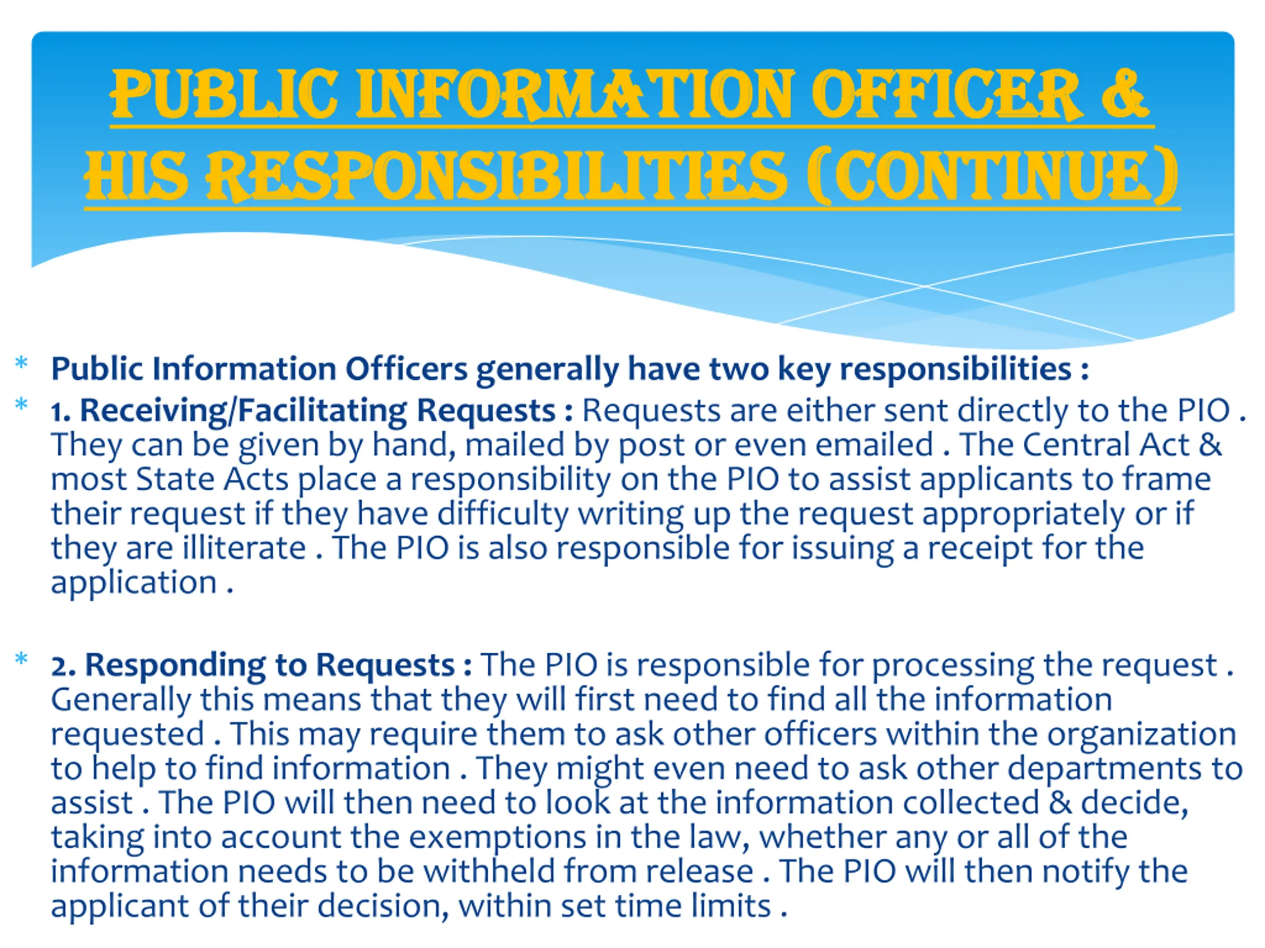 Public information officer & Public information officer & his Responsibilities (continue) his Responsibilities (continue) * Public Information Officers generally have two key responsibilities : * 1. Receiving/Facilitating Requests : Requests are either sent directly to the PIO . They can be given by hand, mailed by post or even emailed . The Central Act & most State Acts place a responsibility on the PIO to assist applicants to frame their request if they have difficulty writing up the request appropriately or if they are illiterate . The PIO is also responsible for issuing a receipt for the application . * 2. Responding to Requests : The PIO is responsible for processing the request . Generally this means that they will first need to find all the information requested . This may require them to ask other officers within the organization to help to find information . They might even need to ask other departments to assist . The PIO will then need to look at the information collected & decide, taking into account the exemptions in the law, whether any or all of the information needs to be withheld from release . The PIO will then notify the applicant of their decision, within set time limits .