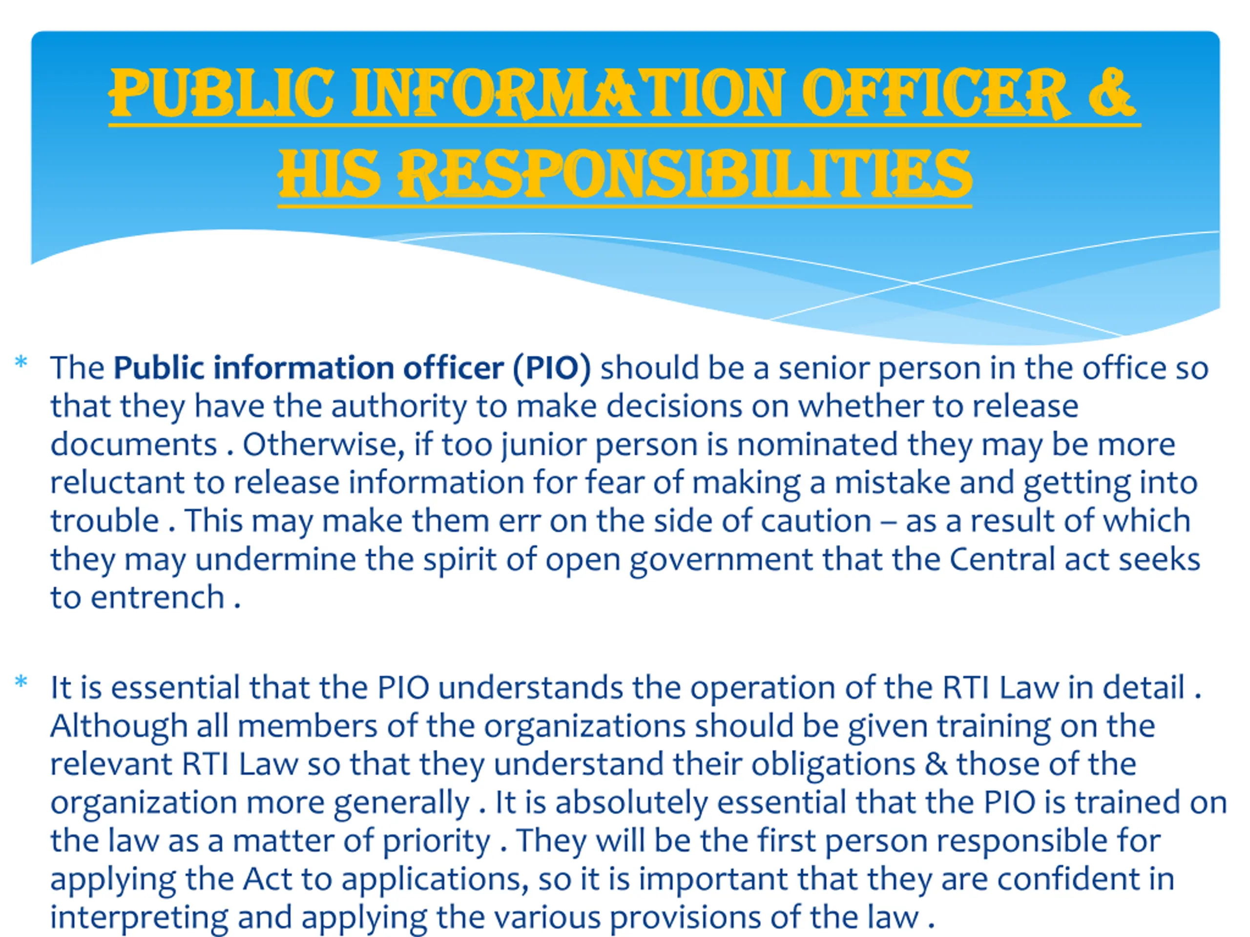Public information officer & Public information officer & his Responsibilities his Responsibilities * The Public information officer (PIO) should be a senior person in the office so that they have the authority to make decisions on whether to release documents . Otherwise, if too junior person is nominated they may be more reluctant to release information for fear of making a mistake and getting into trouble . This may make them err on the side of caution as a result of which they may undermine the spirit of open government that the Central act seeks to entrench . * It is essential that the PIO understands the operation of the RTI Law in detail . Although all members of the organizations should be given training on the relevant RTI Law so that they understand their obligations & those of the organization more generally . It is absolutely essential that the PIO is trained on the law as a matter of priority . They will be the first person responsible for applying the Act to applications, so it is important that they are confident in interpreting and applying the various provisions of the law .