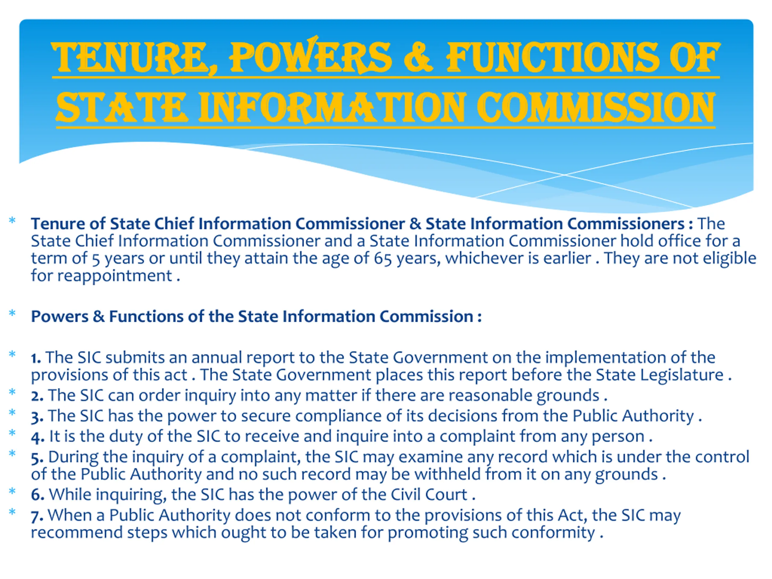 Tenure, Powers & Functions of Tenure, Powers & Functions of State Information Commission State Information Commission * Tenure of State Chief Information Commissioner & State Information Commissioners : The State Chief Information Commissioner and a State Information Commissioner hold office for a term of 5 years or until they attain the age of 65 years, whichever is earlier . They are not eligible for reappointment . * Powers & Functions of the State Information Commission : * 1. The SIC submits an annual report to the State Government on the implementation of the provisions of this act . The State Government places this report before the State Legislature . * 2. The SIC can order inquiry into any matter if there are reasonable grounds . * 3. The SIC has the power to secure compliance of its decisions from the Public Authority . * 4. It is the duty of the SIC to receive and inquire into a complaint from any person . * 5. During the inquiry of a complaint, the SIC may examine any record which is under the control of the Public Authority and no such record may be withheld from it on any grounds . * 6. While inquiring, the SIC has the power of the Civil Court . * 7. When a Public Authority does not conform to the provisions of this Act, the SIC may recommend steps which ought to be taken for promoting such conformity .