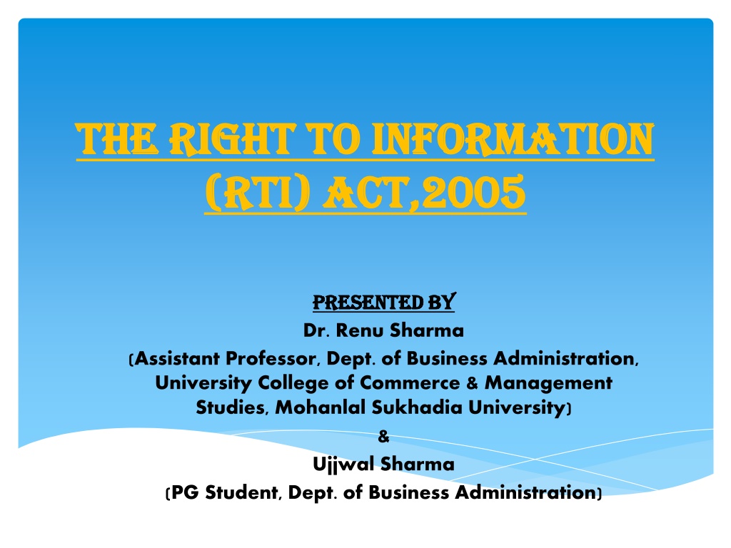 THE RIGHT TO INFORMATION THE RIGHT TO INFORMATION (RTI) ACT,2005 (RTI) ACT,2005 PRESENTED BY PRESENTED BY Dr. Renu Sharma (Assistant Professor, Dept. of Business Administration, University College of Commerce & Management Studies, Mohanlal Sukhadia University) & Ujjwal Sharma (PG Student, Dept. of Business Administration)