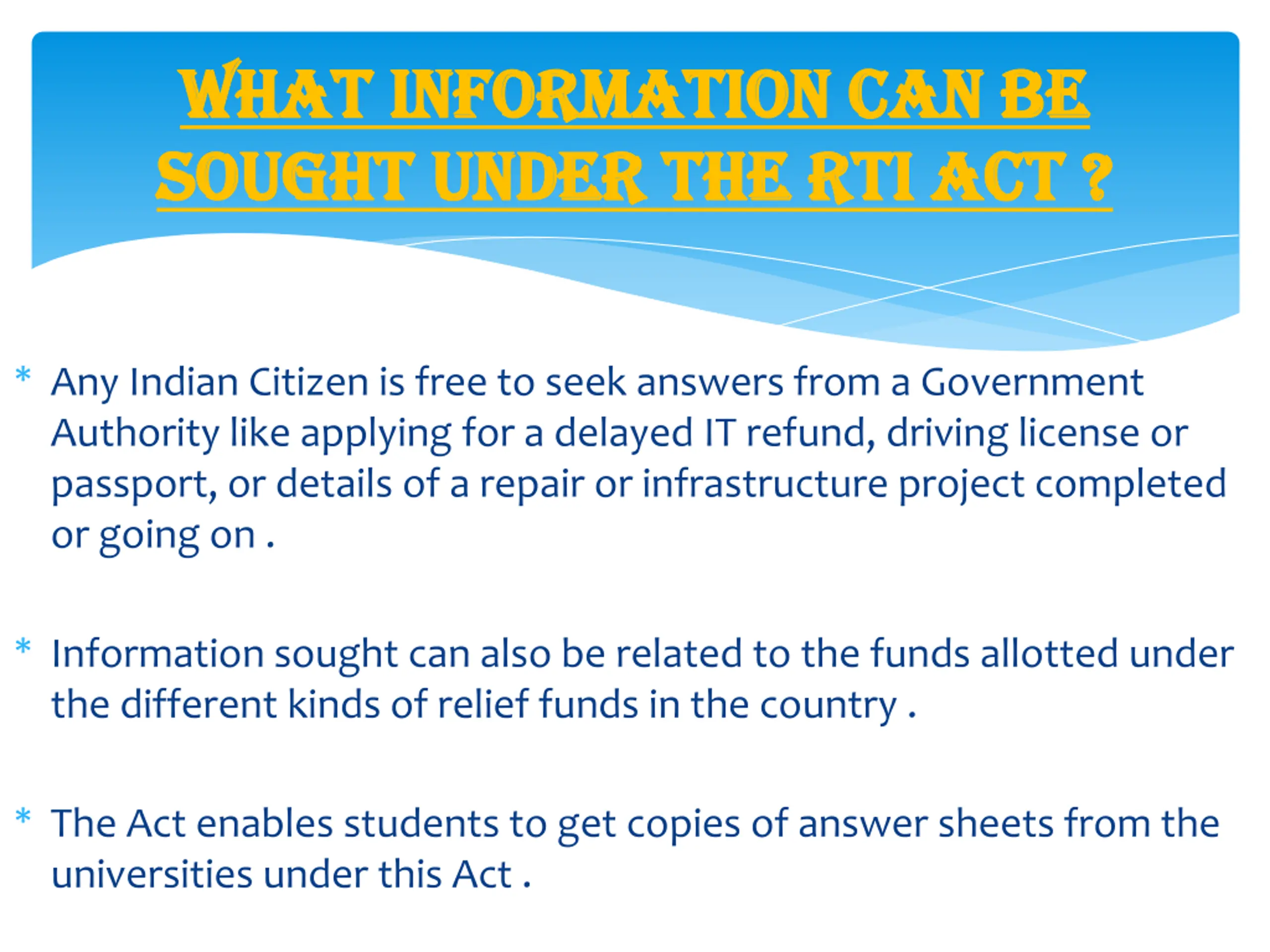 What information can be What information can be sought under the rti act ? sought under the rti act ? * Any Indian Citizen is free to seek answers from a Government Authority like applying for a delayed IT refund, driving license or passport, or details of a repair or infrastructure project completed or going on . * Information sought can also be related to the funds allotted under the different kinds of relief funds in the country . * The Act enables students to get copies of answer sheets from the universities under this Act .