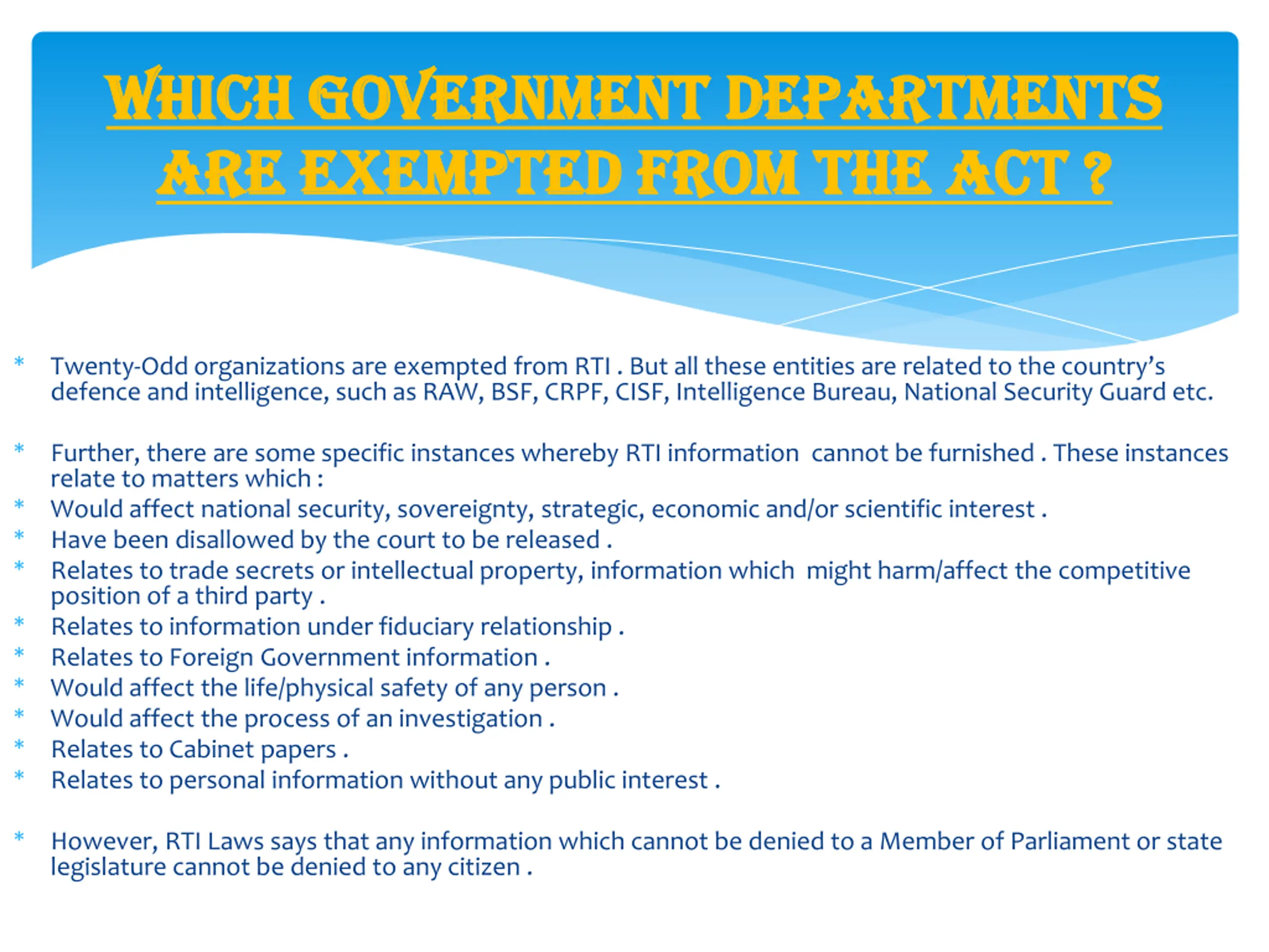 Which Government departments Which Government departments are exempted from the act ? are exempted from the act ? * Twenty-Odd organizations are exempted from RTI . But all these entities are related to the country s defence and intelligence, such as RAW, BSF, CRPF, CISF, Intelligence Bureau, National Security Guard etc. * Further, there are some specific instances whereby RTI information cannot be furnished . These instances relate to matters which : Would affect national security, sovereignty, strategic, economic and/or scientific interest . Have been disallowed by the court to be released . Relates to trade secrets or intellectual property, information which might harm/affect the competitive position of a third party . Relates to information under fiduciary relationship . Relates to Foreign Government information . Would affect the life/physical safety of any person . Would affect the process of an investigation . Relates to Cabinet papers . Relates to personal information without any public interest . * * * * * * * * * * However, RTI Laws says that any information which cannot be denied to a Member of Parliament or state legislature cannot be denied to any citizen .