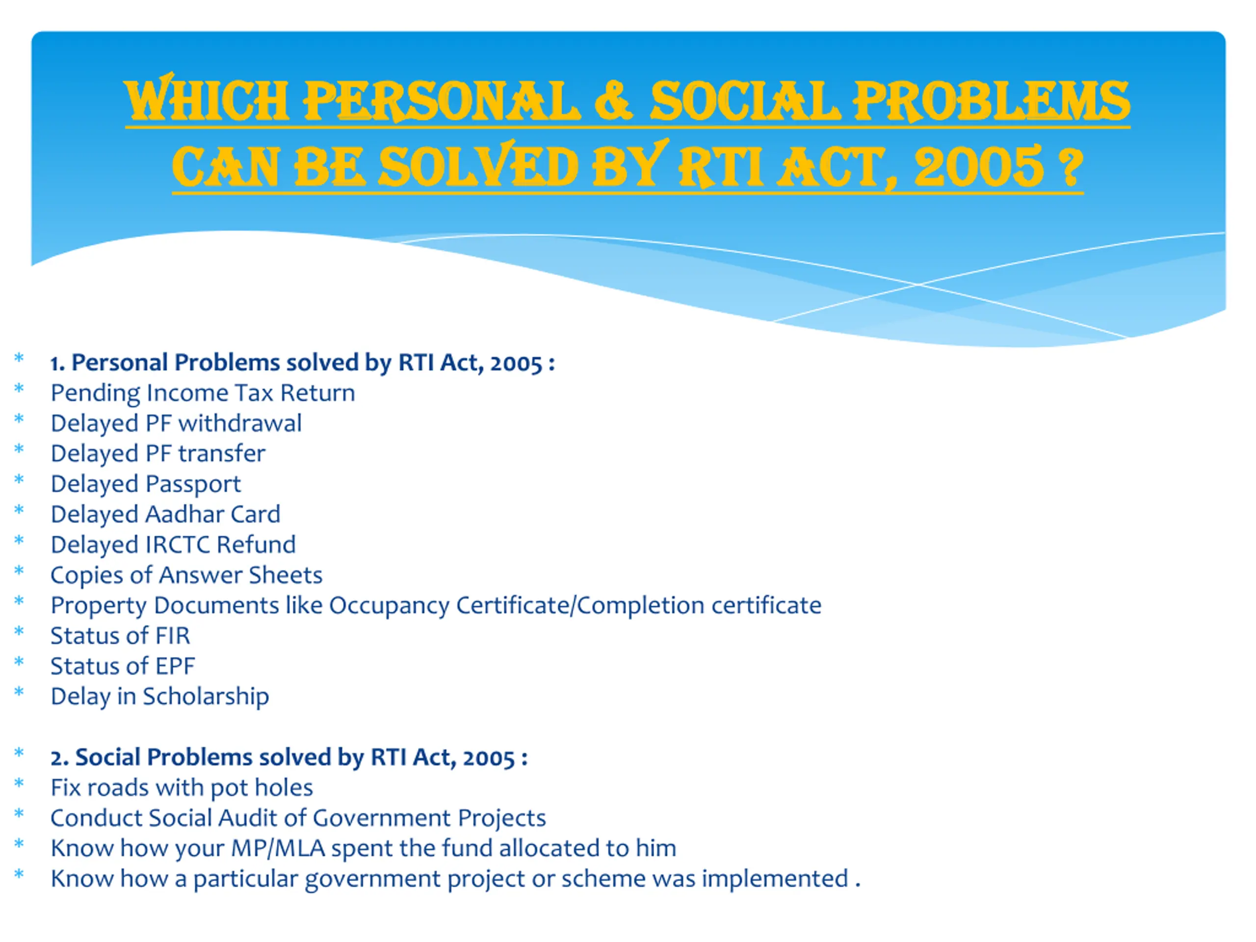 Which personal & social problems Which personal & social problems can be solved by rti act, 2005 ? can be solved by rti act, 2005 ? * * * * * * * * * * * * 1. Personal Problems solved by RTI Act, 2005 : Pending Income Tax Return Delayed PF withdrawal Delayed PF transfer Delayed Passport Delayed Aadhar Card Delayed IRCTC Refund Copies of Answer Sheets Property Documents like Occupancy Certificate/Completion certificate Status of FIR Status of EPF Delay in Scholarship * * * * * 2. Social Problems solved by RTI Act, 2005 : Fix roads with pot holes Conduct Social Audit of Government Projects Know how your MP/MLA spent the fund allocated to him Know how a particular government project or scheme was implemented .