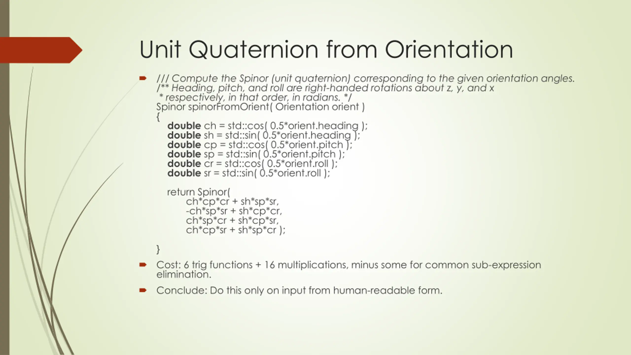 Unit Quaternion from Orientation /// Compute the Spinor (unit quaternion) corresponding to the given orientation angles. /** Heading, pitch, and roll are right-handed rotations about z, y, and x * respectively, in that order, in radians. */ Spinor spinorFromOrient( Orientation orient ) { double ch = std::cos( 0.5*orient.heading ); double sh = std::sin( 0.5*orient.heading ); double cp = std::cos( 0.5*orient.pitch ); double sp = std::sin( 0.5*orient.pitch ); double cr = std::cos( 0.5*orient.roll ); double sr = std::sin( 0.5*orient.roll ); return Spinor( ch*cp*cr + sh*sp*sr, -ch*sp*sr + sh*cp*cr, ch*sp*cr + sh*cp*sr, ch*cp*sr + sh*sp*cr ); } Cost: 6 trig functions + 16 multiplications, minus some for common sub-expression elimination. Conclude: Do this only on input from human-readable form.