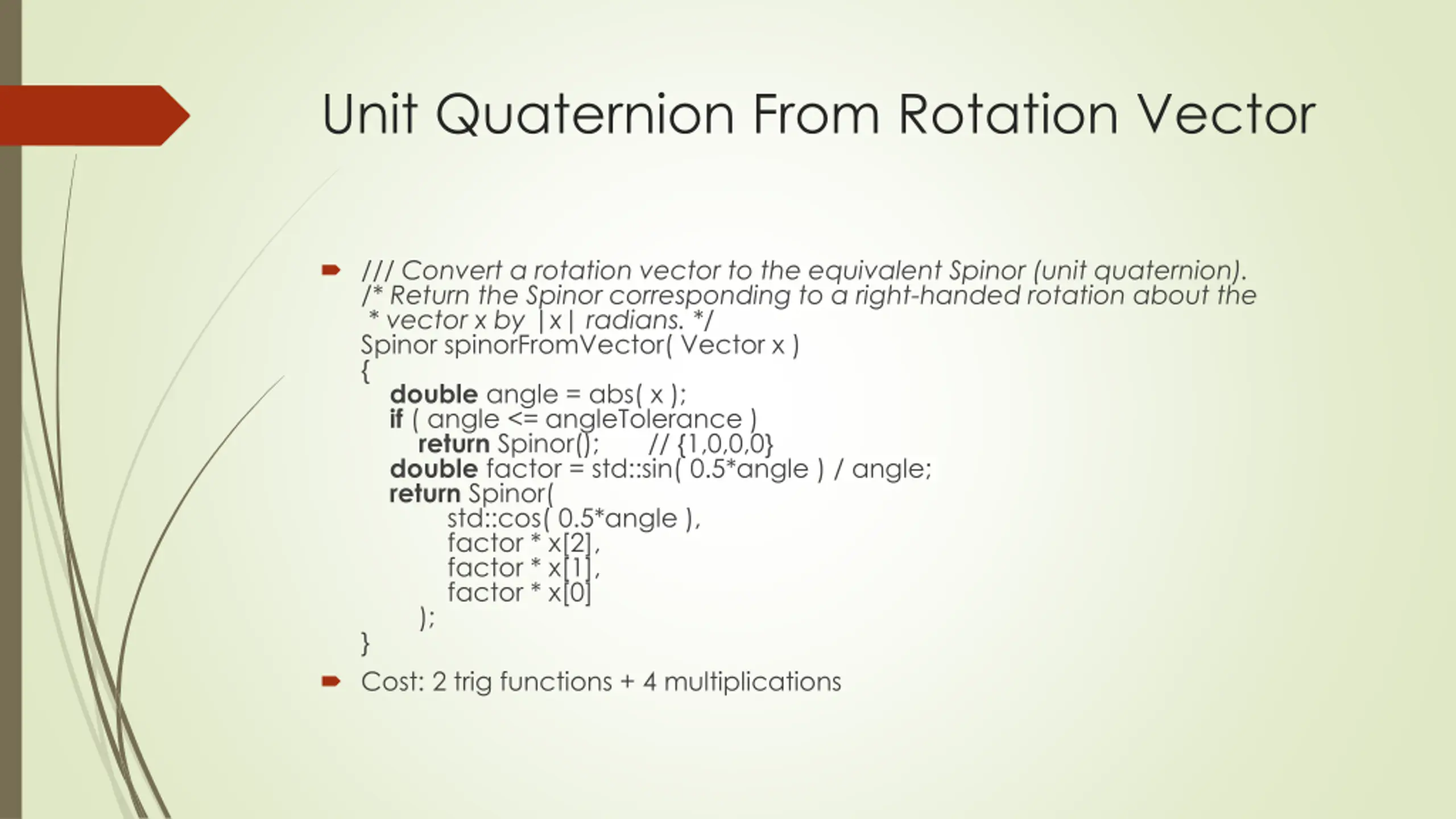 Unit Quaternion From Rotation Vector /// Convert a rotation vector to the equivalent Spinor (unit quaternion). /* Return the Spinor corresponding to a right-handed rotation about the * vector x by |x| radians. */ Spinor spinorFromVector( Vector x ) { double angle = abs( x ); if ( angle <= angleTolerance ) return Spinor(); // {1,0,0,0} double factor = std::sin( 0.5*angle ) / angle; return Spinor( std::cos( 0.5*angle ), factor * x[2], factor * x[1], factor * x[0] ); } Cost: 2 trig functions + 4 multiplications