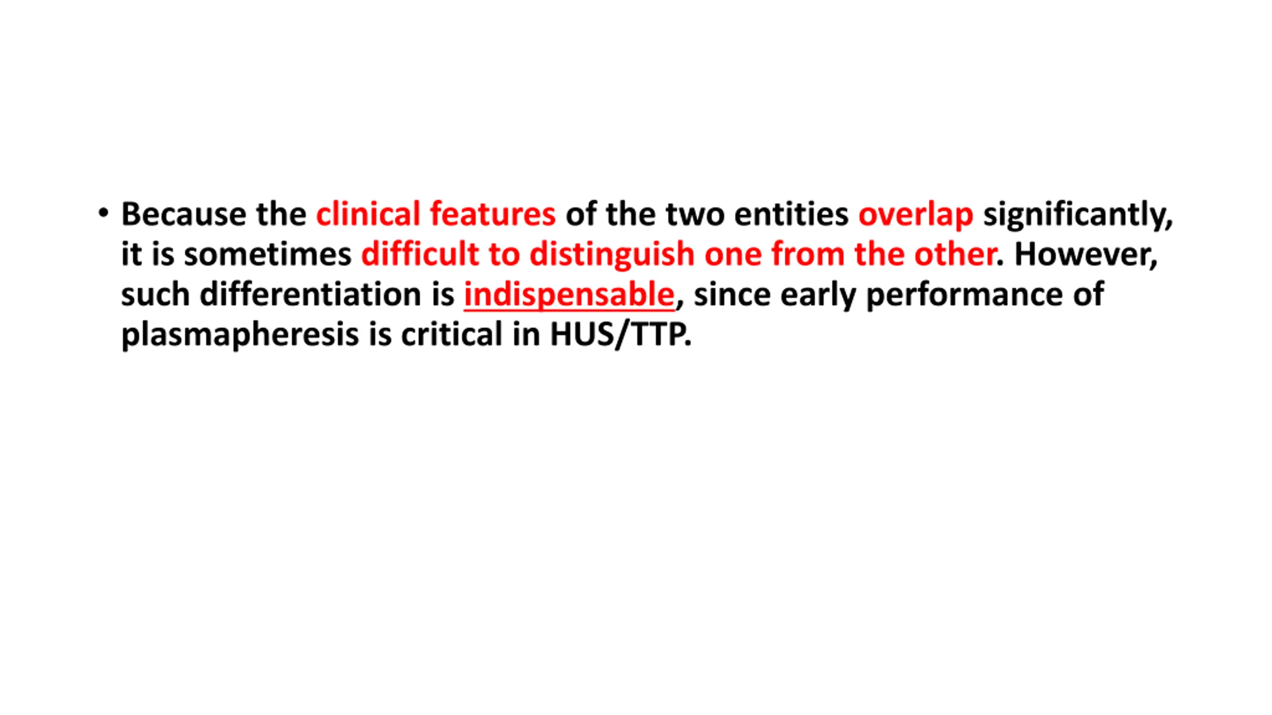 Because the clinical features of the two entities overlap significantly, it is sometimes difficult to distinguish one from the other. However, such differentiation is indispensable, since early performance of plasmapheresis is critical in HUS/TTP.