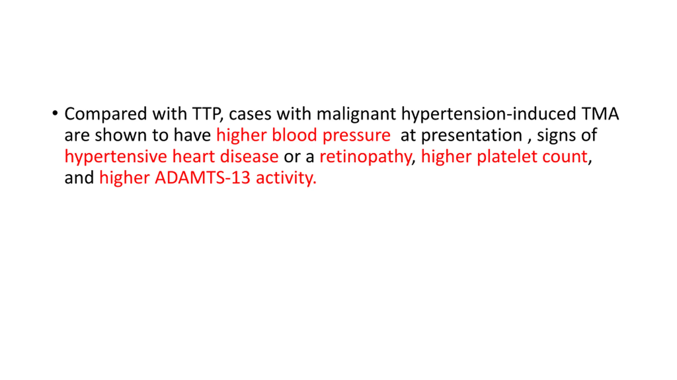 Compared with TTP, cases with malignant hypertension-induced TMA are shown to have higher blood pressure at presentation , signs of hypertensive heart disease or a retinopathy, higher platelet count, and higher ADAMTS-13 activity.