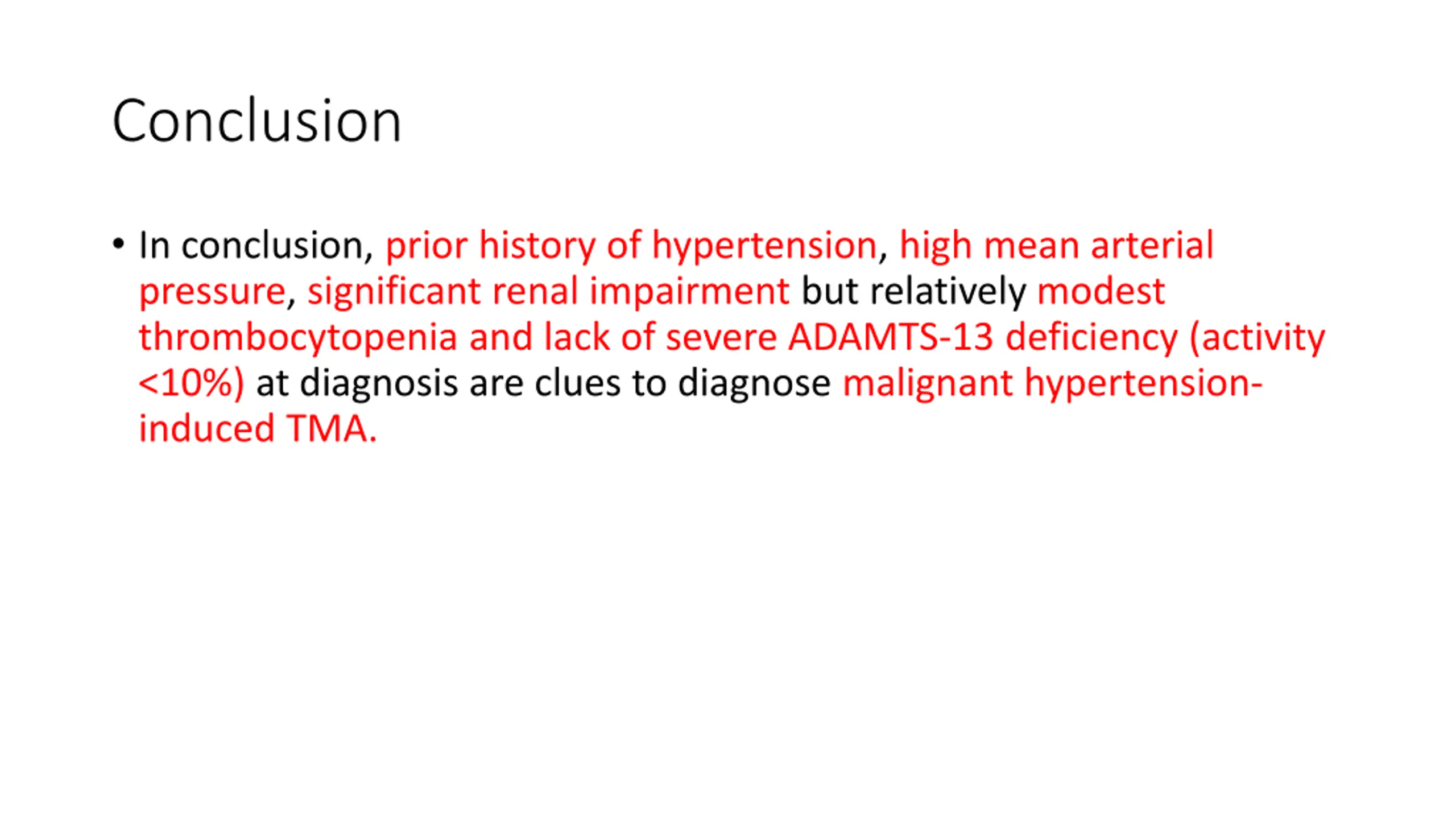 Conclusion In conclusion, prior history of hypertension, high mean arterial pressure, significant renal impairment but relatively modest thrombocytopenia and lack of severe ADAMTS-13 deficiency (activity <10%) at diagnosis are clues to diagnose malignant hypertension- induced TMA.