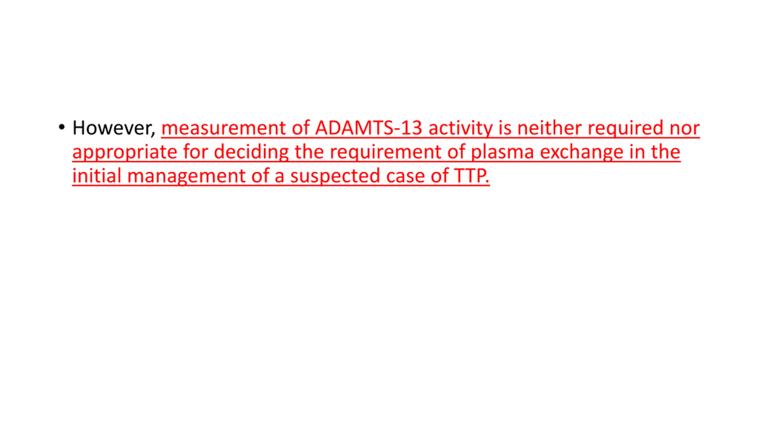 However, measurement of ADAMTS-13 activity is neither required nor appropriate for deciding the requirement of plasma exchange in the initial management of a suspected case of TTP.