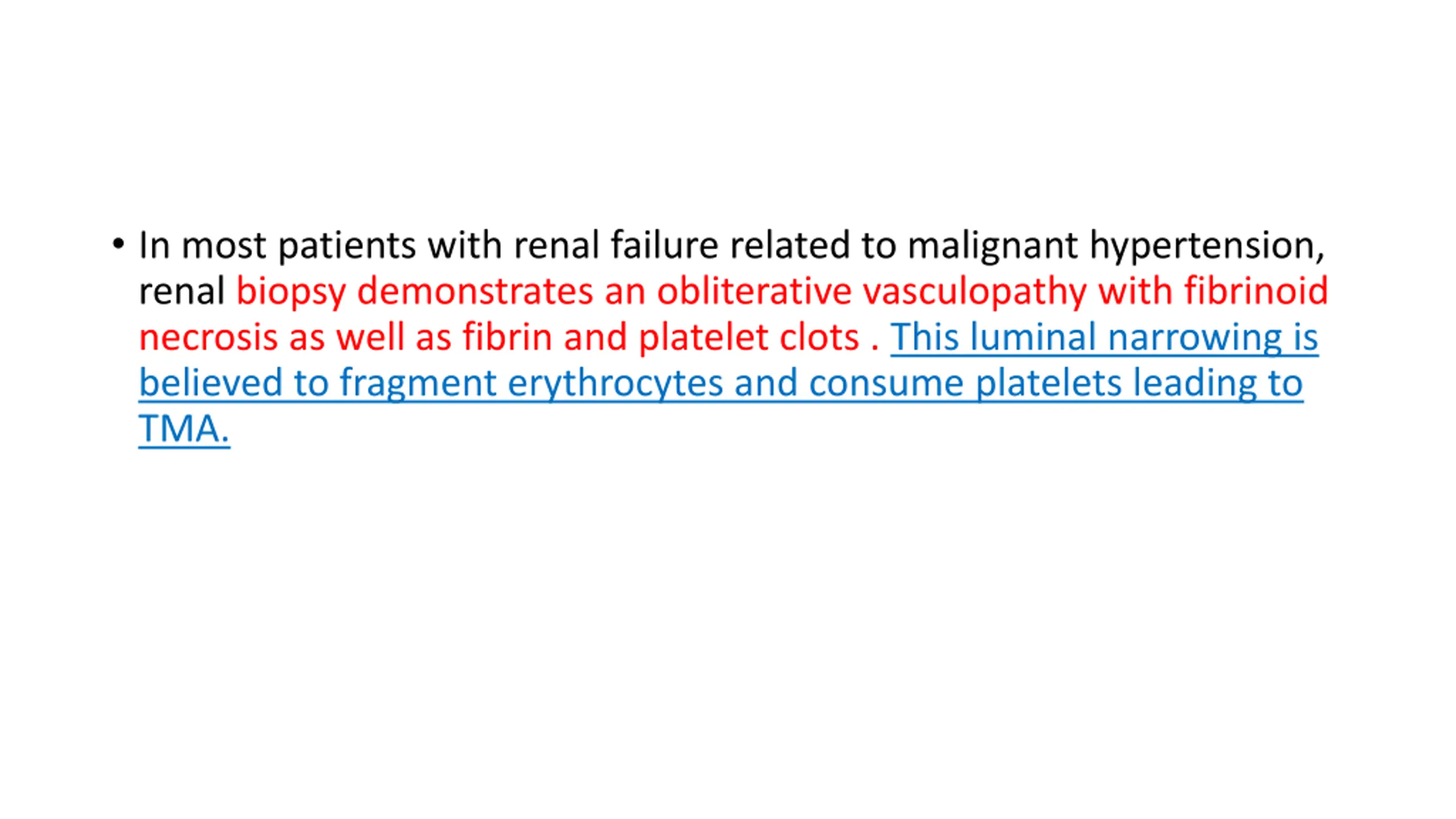 In most patients with renal failure related to malignant hypertension, renal biopsy demonstrates an obliterative vasculopathy with fibrinoid necrosis as well as fibrin and platelet clots . This luminal narrowing is believed to fragment erythrocytes and consume platelets leading to TMA.
