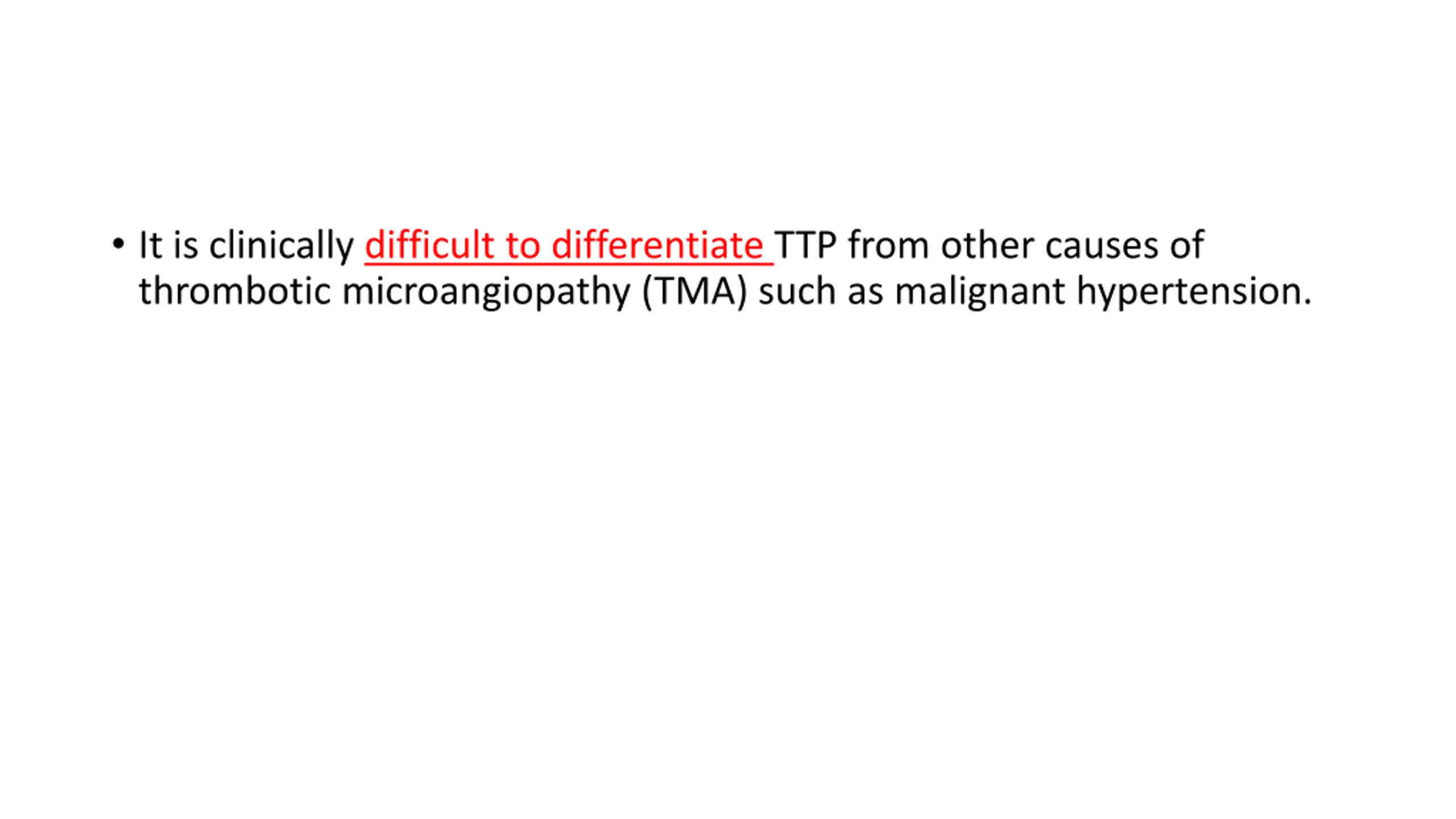 It is clinically difficult to differentiate TTP from other causes of thrombotic microangiopathy (TMA) such as malignant hypertension.