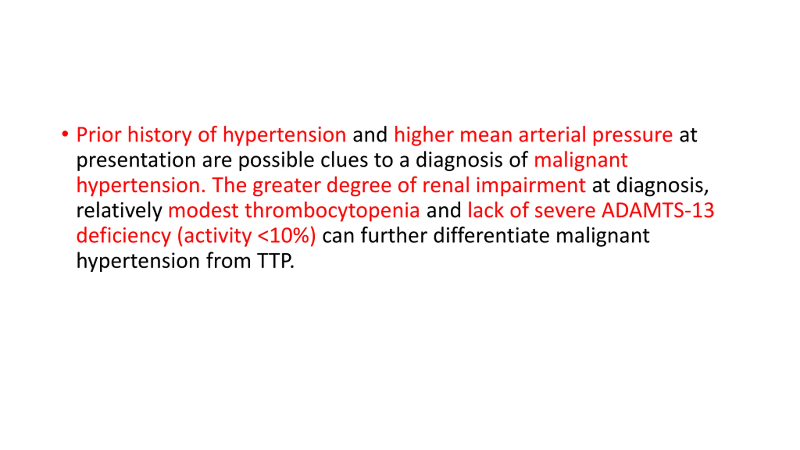 Prior history of hypertension and higher mean arterial pressure at presentation are possible clues to a diagnosis of malignant hypertension. The greater degree of renal impairment at diagnosis, relatively modest thrombocytopenia and lack of severe ADAMTS-13 deficiency (activity <10%) can further differentiate malignant hypertension from TTP.