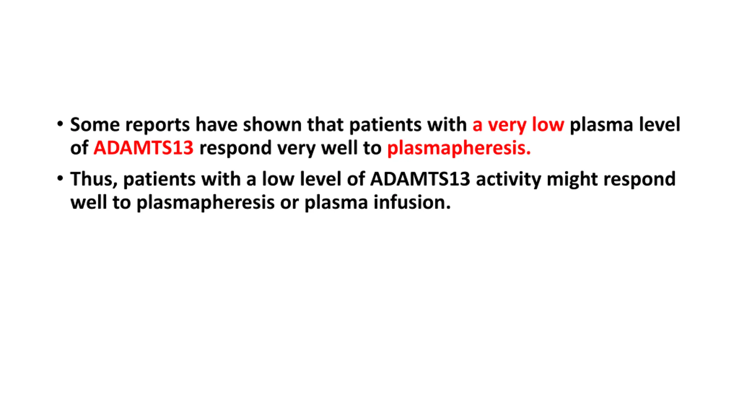 Some reports have shown that patients with a very low plasma level of ADAMTS13 respond very well to plasmapheresis. Thus, patients with a low level of ADAMTS13 activity might respond well to plasmapheresis or plasma infusion.