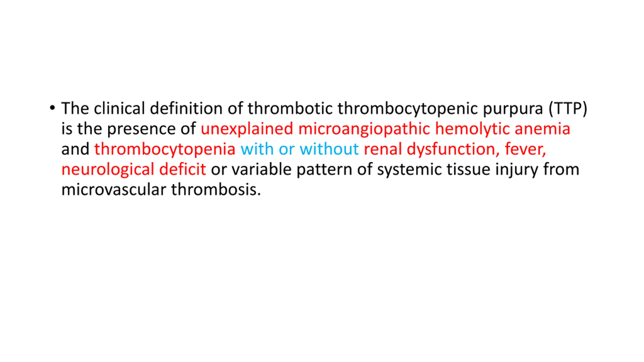 The clinical definition of thrombotic thrombocytopenic purpura (TTP) is the presence of unexplained microangiopathic hemolytic anemia and thrombocytopenia with or without renal dysfunction, fever, neurological deficit or variable pattern of systemic tissue injury from microvascular thrombosis.