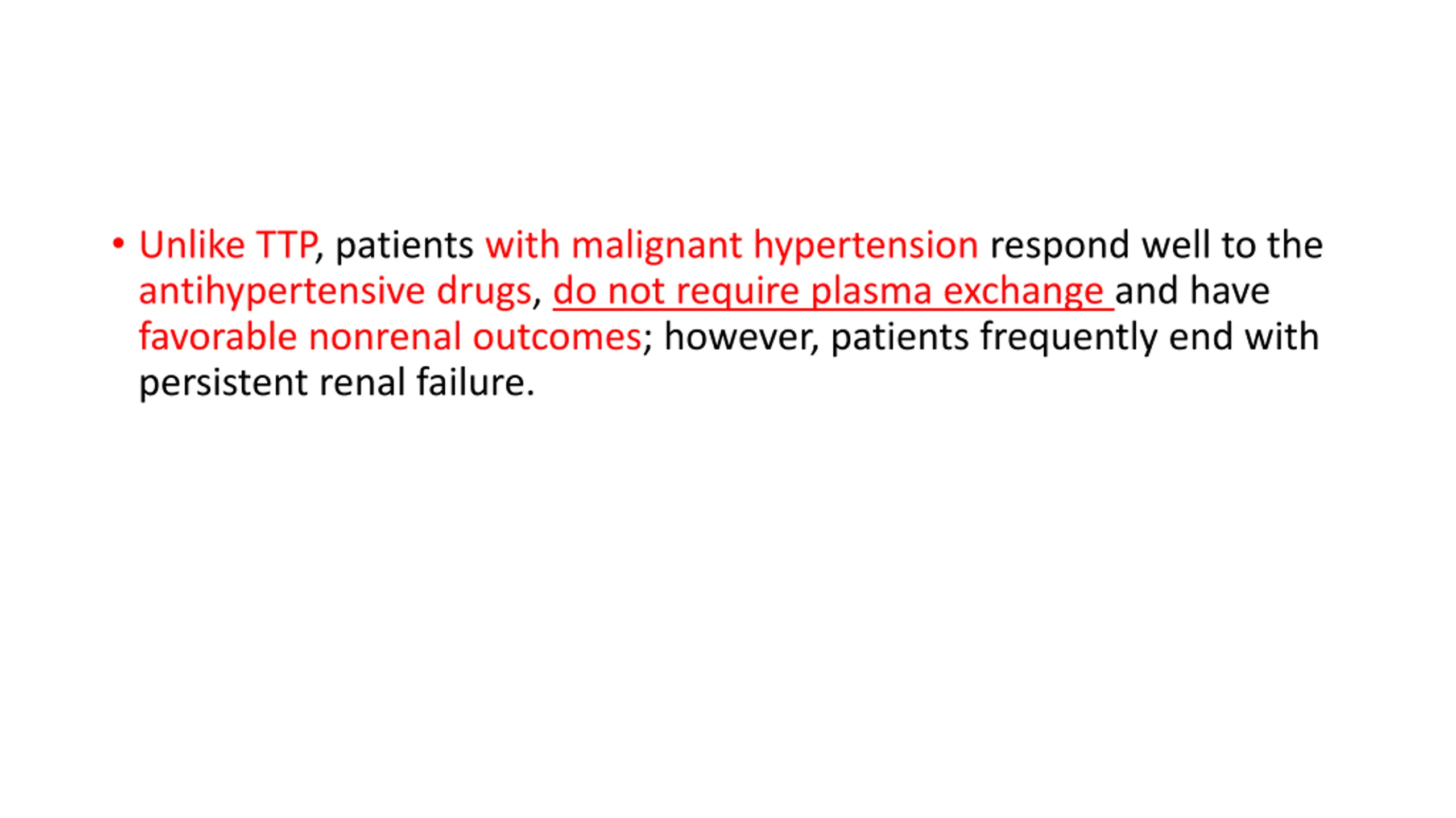 Unlike TTP, patients with malignant hypertension respond well to the antihypertensive drugs, do not require plasma exchange and have favorable nonrenal outcomes; however, patients frequently end with persistent renal failure.