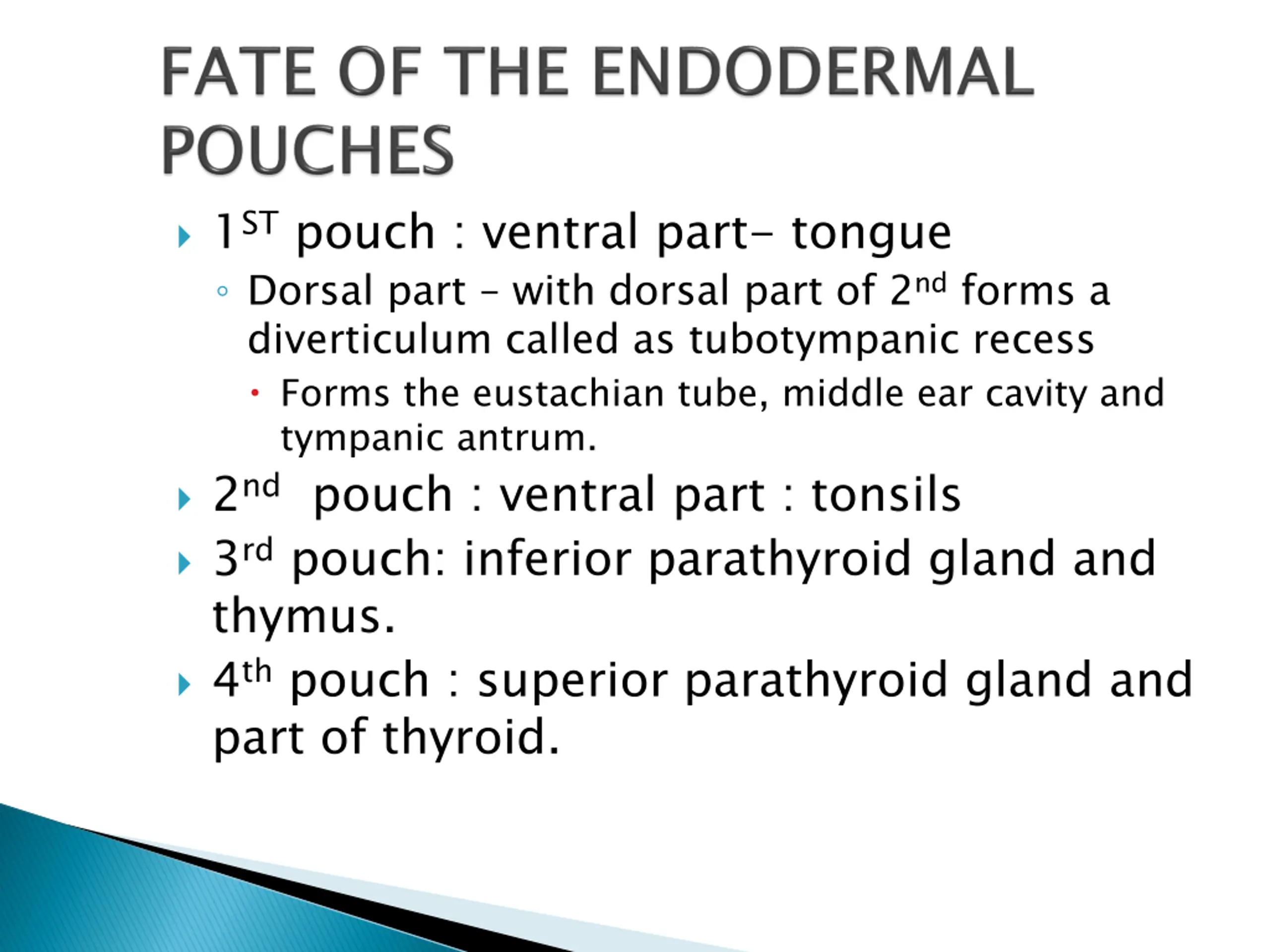 1STpouch : ventral part- tongue Dorsal part with dorsal part of 2ndforms a diverticulum called as tubotympanic recess Forms the eustachian tube, middle ear cavity and tympanic antrum. 2ndpouch : ventral part : tonsils 3rdpouch: inferior parathyroid gland and thymus. 4thpouch : superior parathyroid gland and part of thyroid.