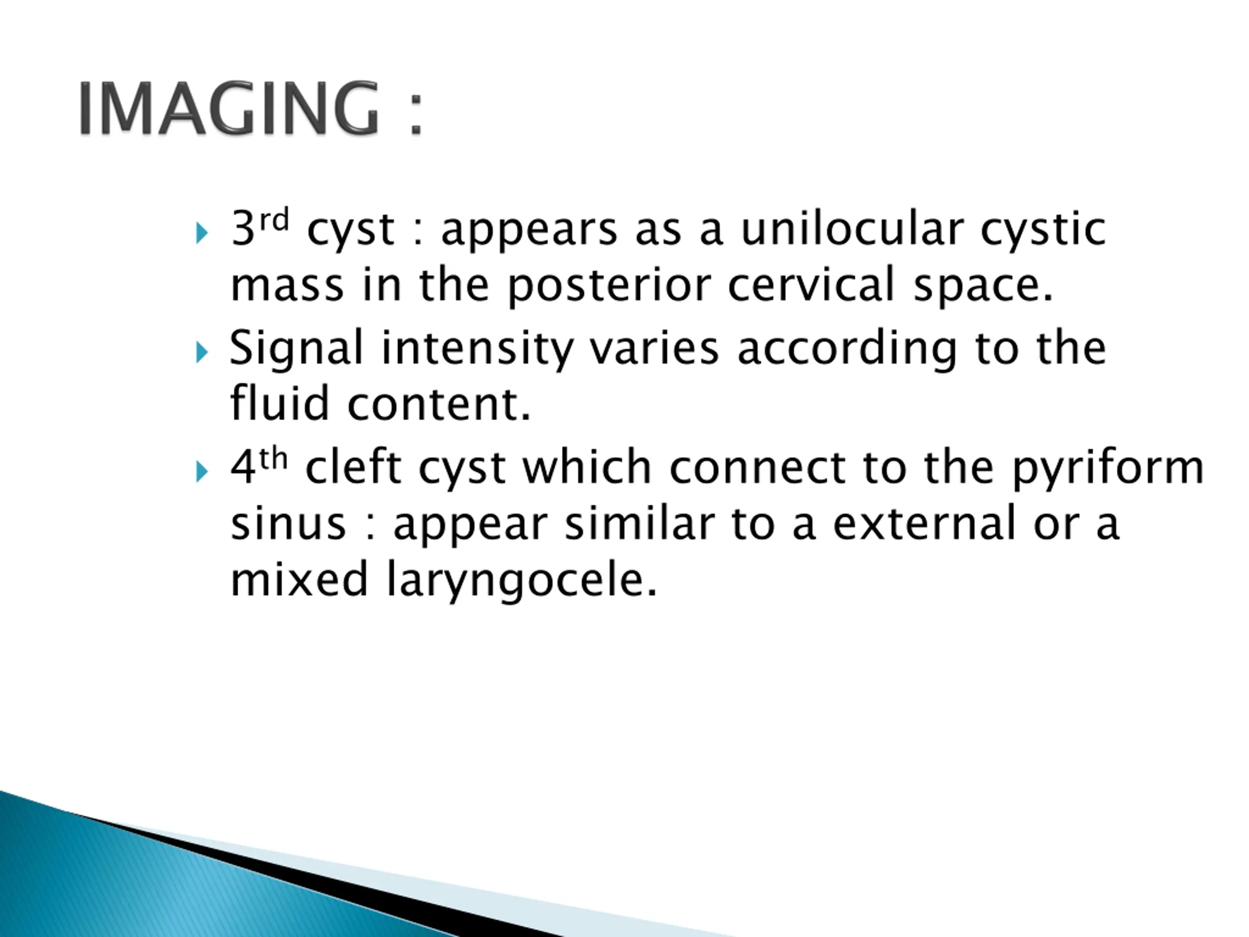 3rdcyst : appears as a unilocular cystic mass in the posterior cervical space. Signal intensity varies according to the fluid content. 4thcleft cyst which connect to the pyriform sinus : appear similar to a external or a mixed laryngocele.