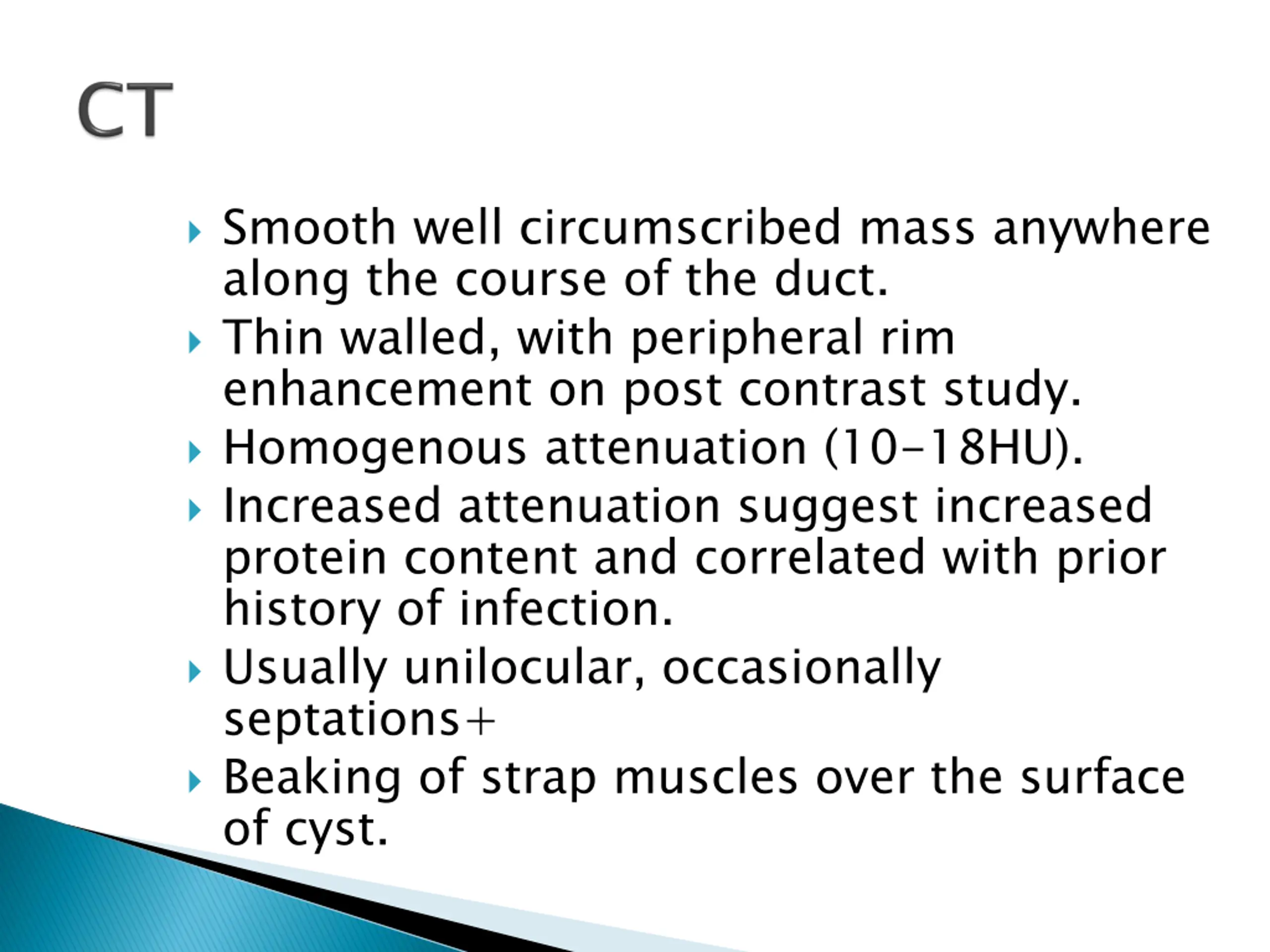 Smooth well circumscribed mass anywhere along the course of the duct. Thin walled, with peripheral rim enhancement on post contrast study. Homogenous attenuation (10-18HU). Increased attenuation suggest increased protein content and correlated with prior history of infection. Usually unilocular, occasionally septations+ Beaking of strap muscles over the surface of cyst.