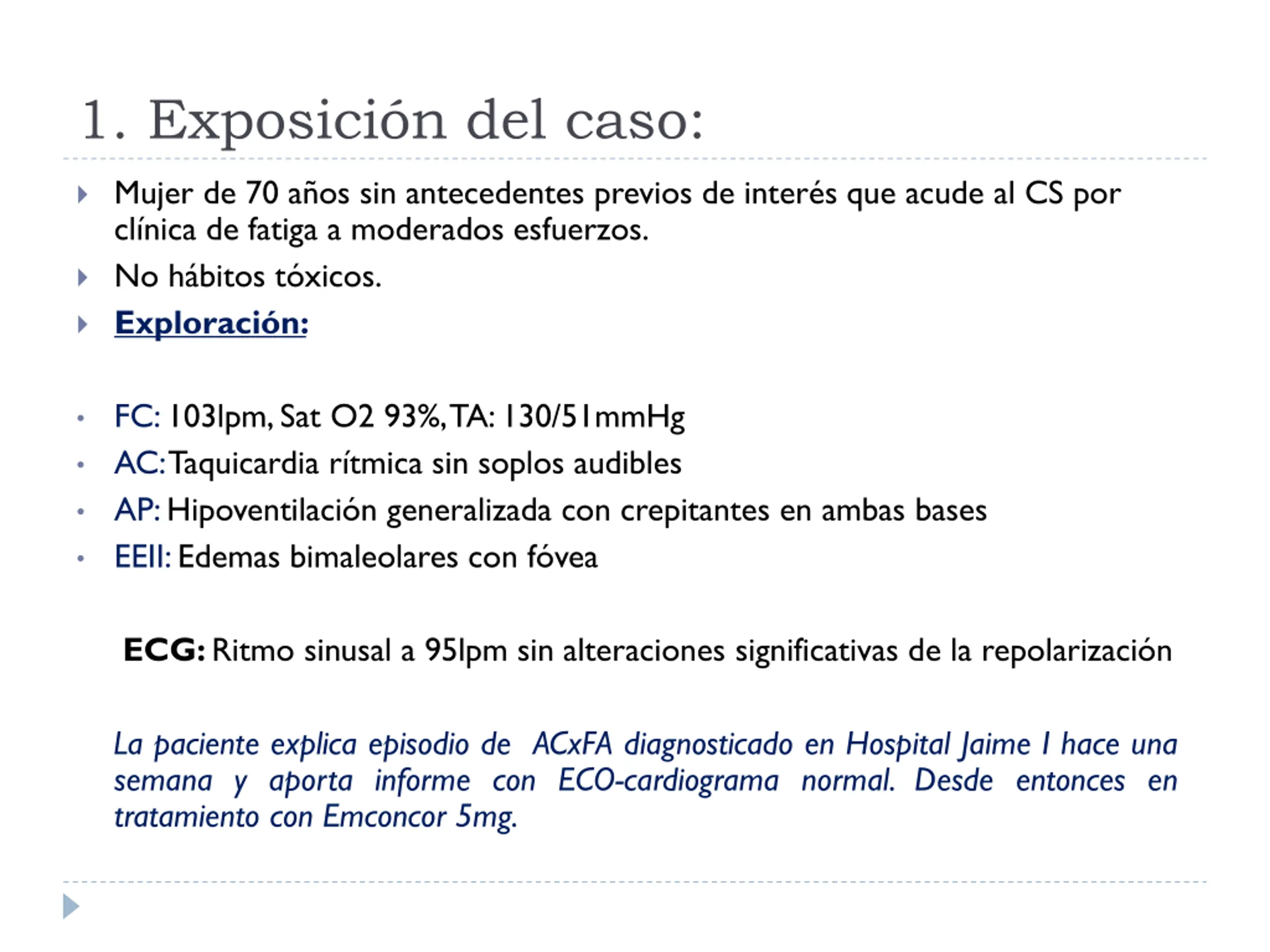 1. Exposicin del caso: Mujer de 70 a os sin antecedentes previos de inter s que acude al CS por cl nica de fatiga a moderados esfuerzos. No h bitos t xicos. Exploraci n: FC: 103lpm, Sat O2 93%, TA: 130/51mmHg AC: Taquicardia r tmica sin soplos audibles AP: Hipoventilaci n generalizada con crepitantes en ambas bases EEII: Edemas bimaleolares con f vea ECG: Ritmo sinusal a 95lpm sin alteraciones significativas de la repolarizaci n La paciente explica episodio de ACxFA diagnosticado en Hospital Jaime I hace una semana y aporta informe con ECO-cardiograma normal. Desde entonces en tratamiento con Emconcor 5mg.