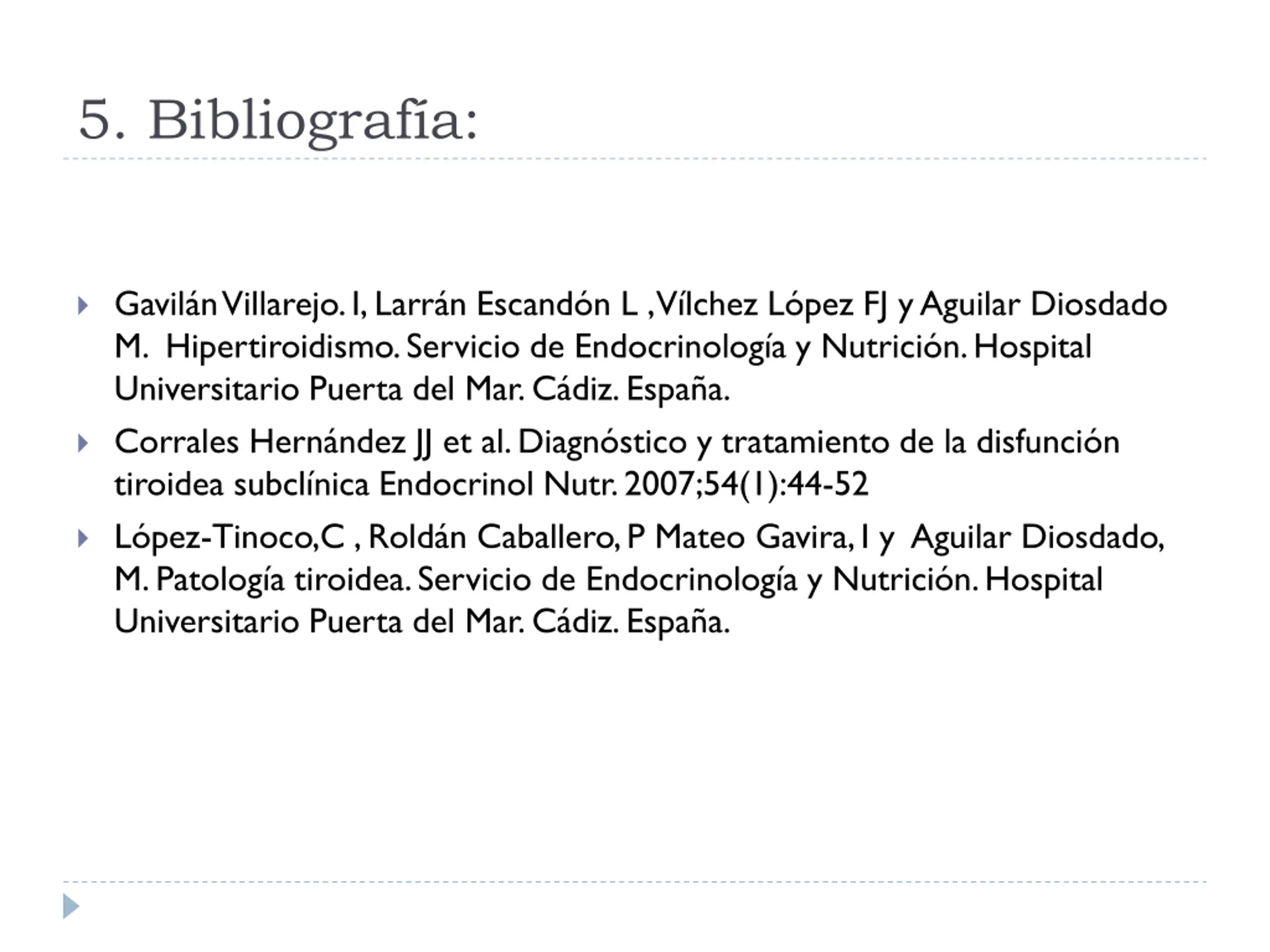 5. Bibliografa: Gavil n Villarejo. I, Larr n Escand n L , V lchez L pez FJ y Aguilar Diosdado M. Hipertiroidismo. Servicio de Endocrinolog a y Nutrici n. Hospital Universitario Puerta del Mar. C diz. Espa a. Corrales Hern ndez JJ et al. Diagn stico y tratamiento de la disfunci n tiroidea subcl nica Endocrinol Nutr. 2007;54(1):44-52 L pez-Tinoco,C , Rold n Caballero, P Mateo Gavira, I y Aguilar Diosdado, M. Patolog a tiroidea. Servicio de Endocrinolog a y Nutrici n. Hospital Universitario Puerta del Mar. C diz. Espa a.