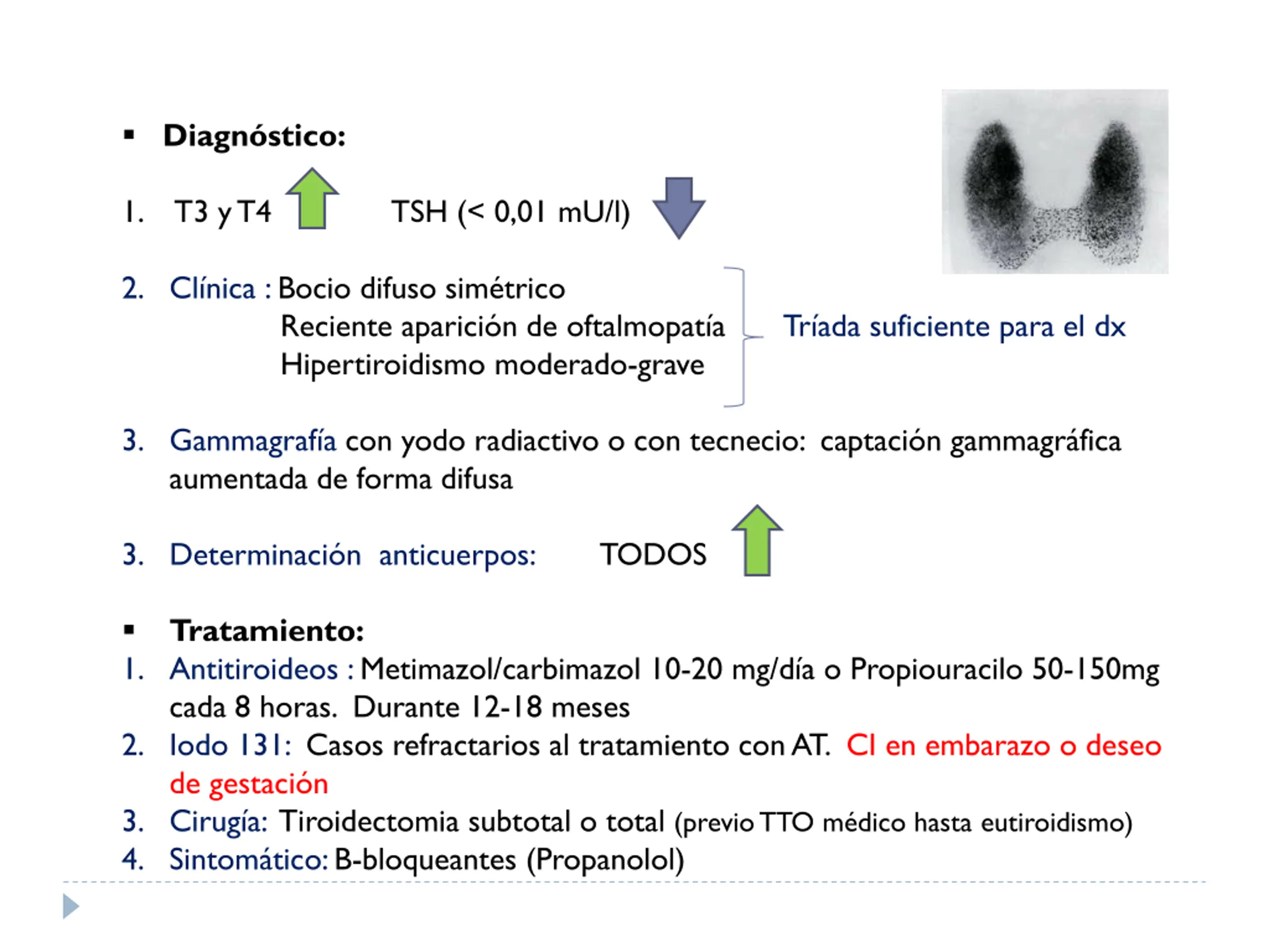 Diagnstico: 1. T3 y T4 TSH (< 0,01 mU/l) 2. Cl nica : Bocio difuso sim trico Reciente aparici n de oftalmopat a Tr ada suficiente para el dx Hipertiroidismo moderado-grave 3. Gammagraf a con yodo radiactivo o con tecnecio: captaci n gammagr fica aumentada de forma difusa 3. Determinaci n anticuerpos: TODOS Tratamiento: 1. Antitiroideos : Metimazol/carbimazol 10-20 mg/d a o Propiouracilo 50-150mg cada 8 horas. Durante 12-18 meses 2. Iodo 131: Casos refractarios al tratamiento con AT. CI en embarazo o deseo de gestaci n 3. Cirug a: Tiroidectomia subtotal o total (previo TTO m dico hasta eutiroidismo) 4. Sintom tico: B-bloqueantes (Propanolol)