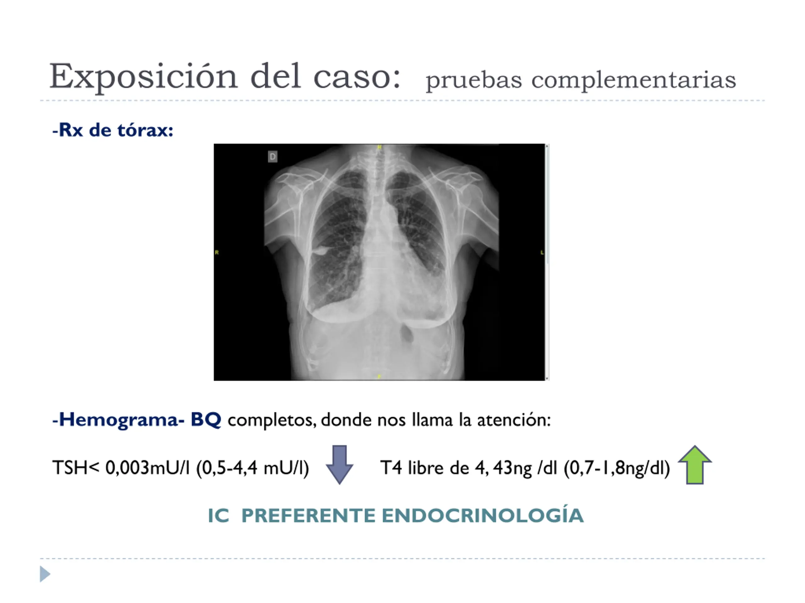 Exposicin del caso: pruebas complementarias -Rx de t rax: -Hemograma- BQ completos, donde nos llama la atenci n: TSH< 0,003mU/l (0,5-4,4 mU/l) T4 libre de 4, 43ng /dl (0,7-1,8ng/dl) IC PREFERENTE ENDOCRINOLOG A