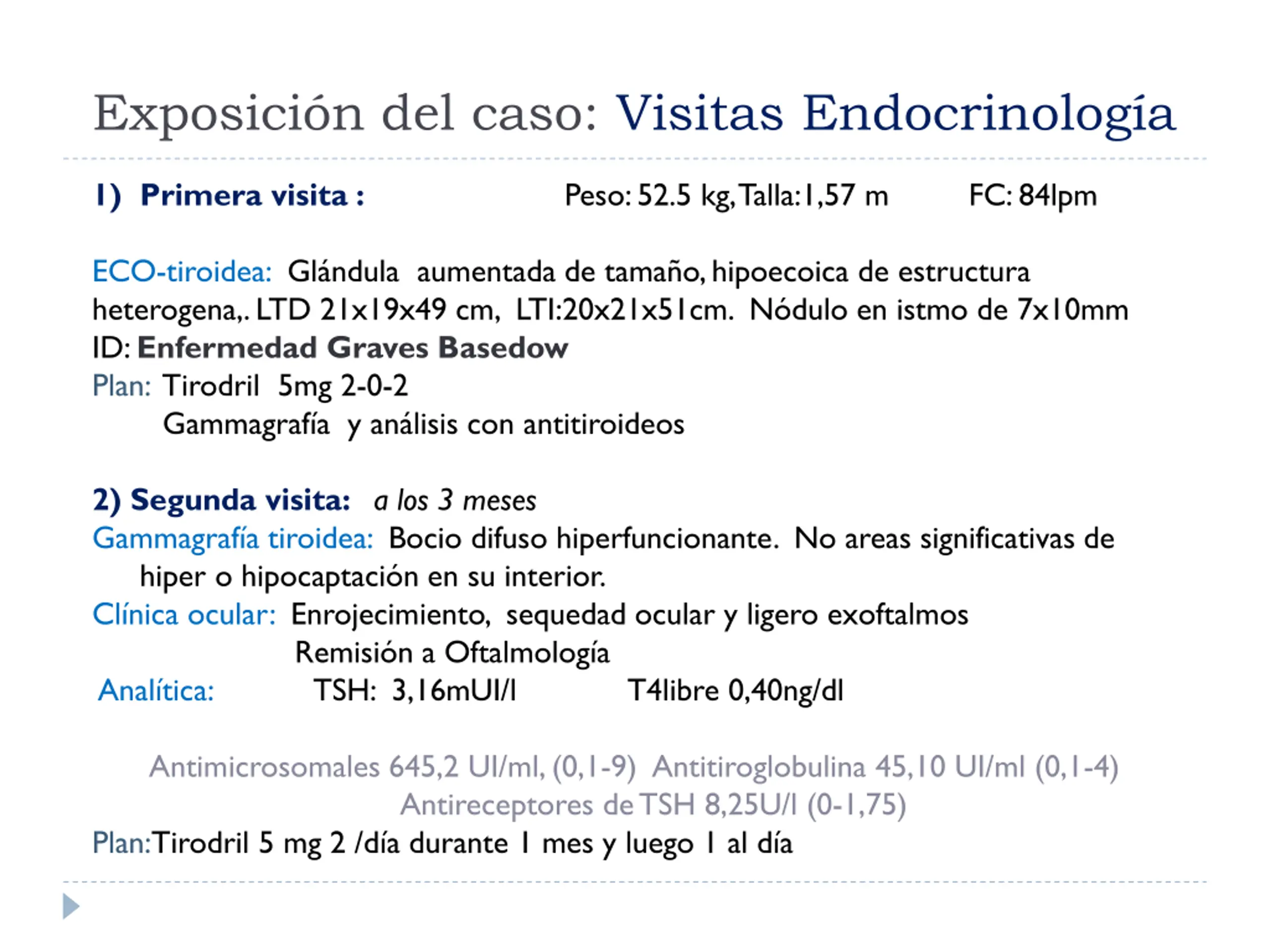 Exposicin del caso: Visitas Endocrinologa 1) Primera visita : Peso: 52.5 kg, Talla:1,57 m FC: 84lpm ECO-tiroidea: Gl ndula aumentada de tama o, hipoecoica de estructura heterogena,. LTD 21x19x49 cm, LTI:20x21x51cm. N dulo en istmo de 7x10mm ID: Enfermedad Graves Basedow Plan: Tirodril 5mg 2-0-2 Gammagraf a y an lisis con antitiroideos 2) Segunda visita: a los 3 meses Gammagraf a tiroidea: Bocio difuso hiperfuncionante. No areas significativas de hiper o hipocaptaci n en su interior. Cl nica ocular: Enrojecimiento, sequedad ocular y ligero exoftalmos Remisi n a Oftalmolog a Anal tica: TSH: 3,16mUI/l T4libre 0,40ng/dl Antimicrosomales 645,2 UI/ml, (0,1-9) Antitiroglobulina 45,10 UI/ml (0,1-4) Antireceptores de TSH 8,25U/l (0-1,75) Plan:Tirodril 5 mg 2 /d a durante 1 mes y luego 1 al d a
