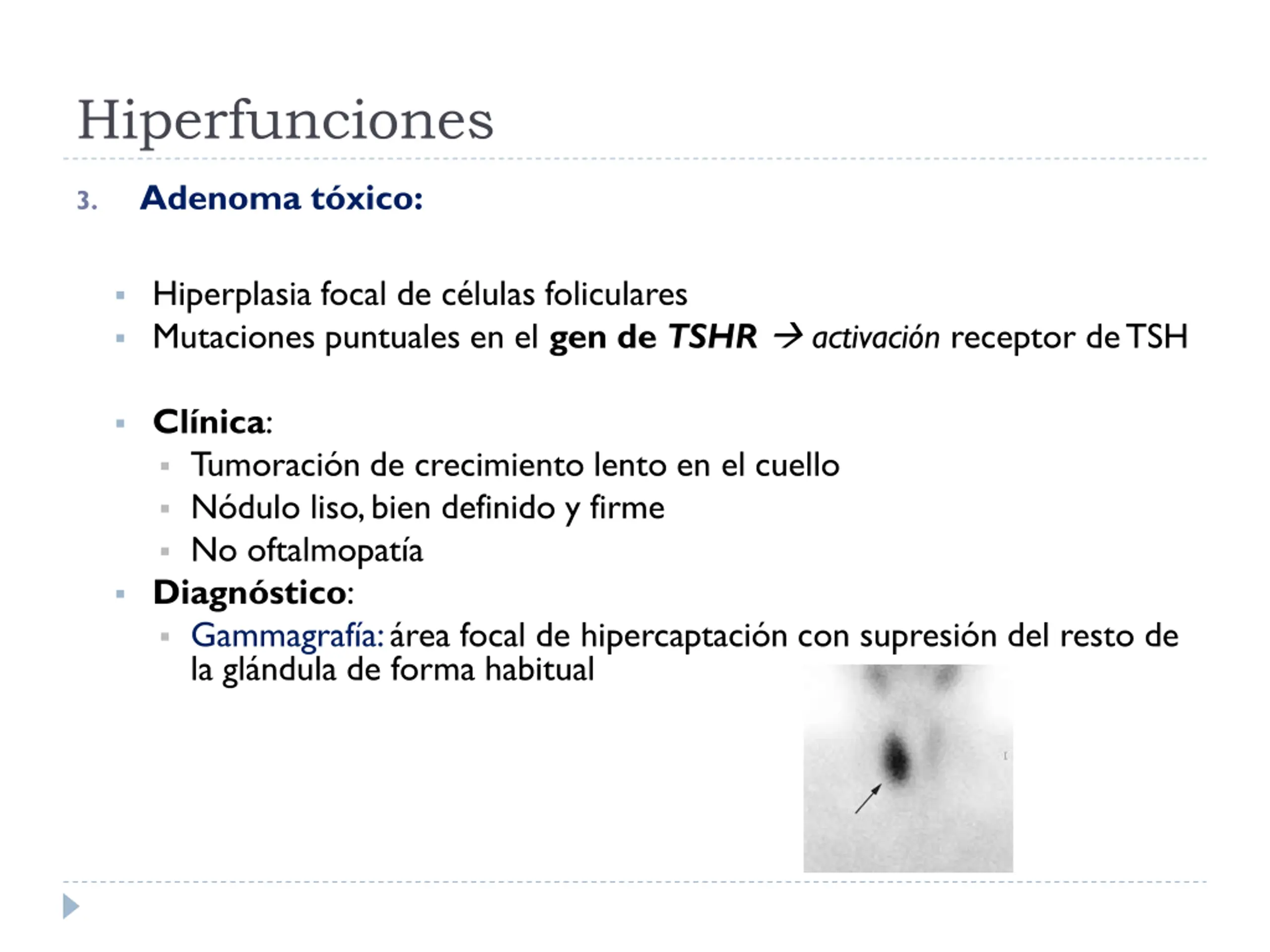 Hiperfunciones Adenoma t xico: 3. Hiperplasia focal de c lulas foliculares Mutaciones puntuales en el gen de TSHR activaci n receptor de TSH Cl nica: Tumoraci n de crecimiento lento en el cuello N dulo liso, bien definido y firme No oftalmopat a Diagn stico: Gammagraf a: rea focal de hipercaptaci n con supresi n del resto de la gl ndula de forma habitual