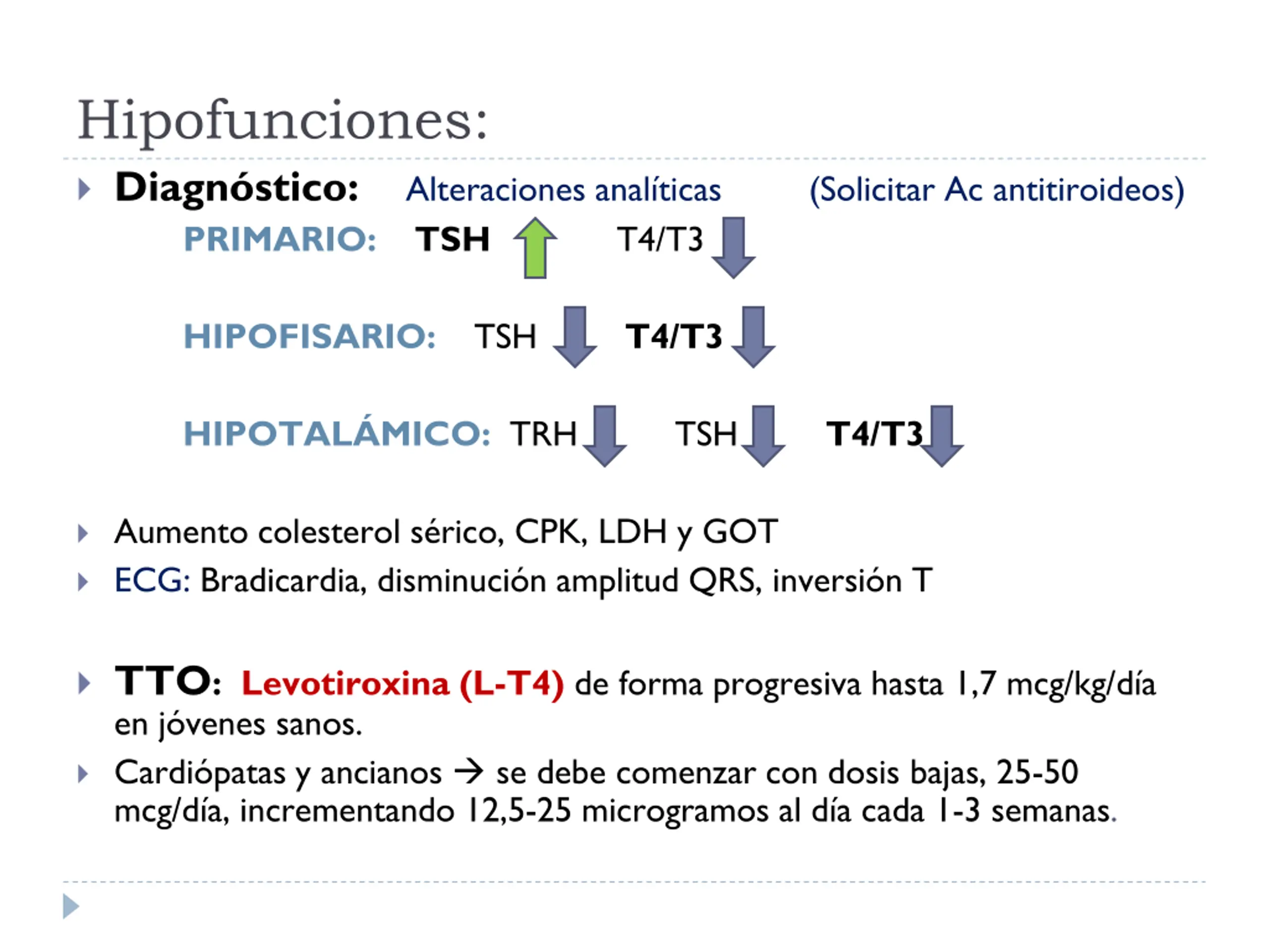 Hipofunciones: Diagn stico: Alteraciones anal ticas (Solicitar Ac antitiroideos) PRIMARIO: TSH T4/T3 HIPOFISARIO: TSH T4/T3 HIPOTAL MICO: TRH TSH T4/T3 Aumento colesterol s rico, CPK, LDH y GOT ECG: Bradicardia, disminuci n amplitud QRS, inversi n T TTO: Levotiroxina (L-T4) de forma progresiva hasta 1,7 mcg/kg/d a en j venes sanos. Cardi patas y ancianos se debe comenzar con dosis bajas, 25-50 mcg/d a, incrementando 12,5-25 microgramos al d a cada 1-3 semanas.