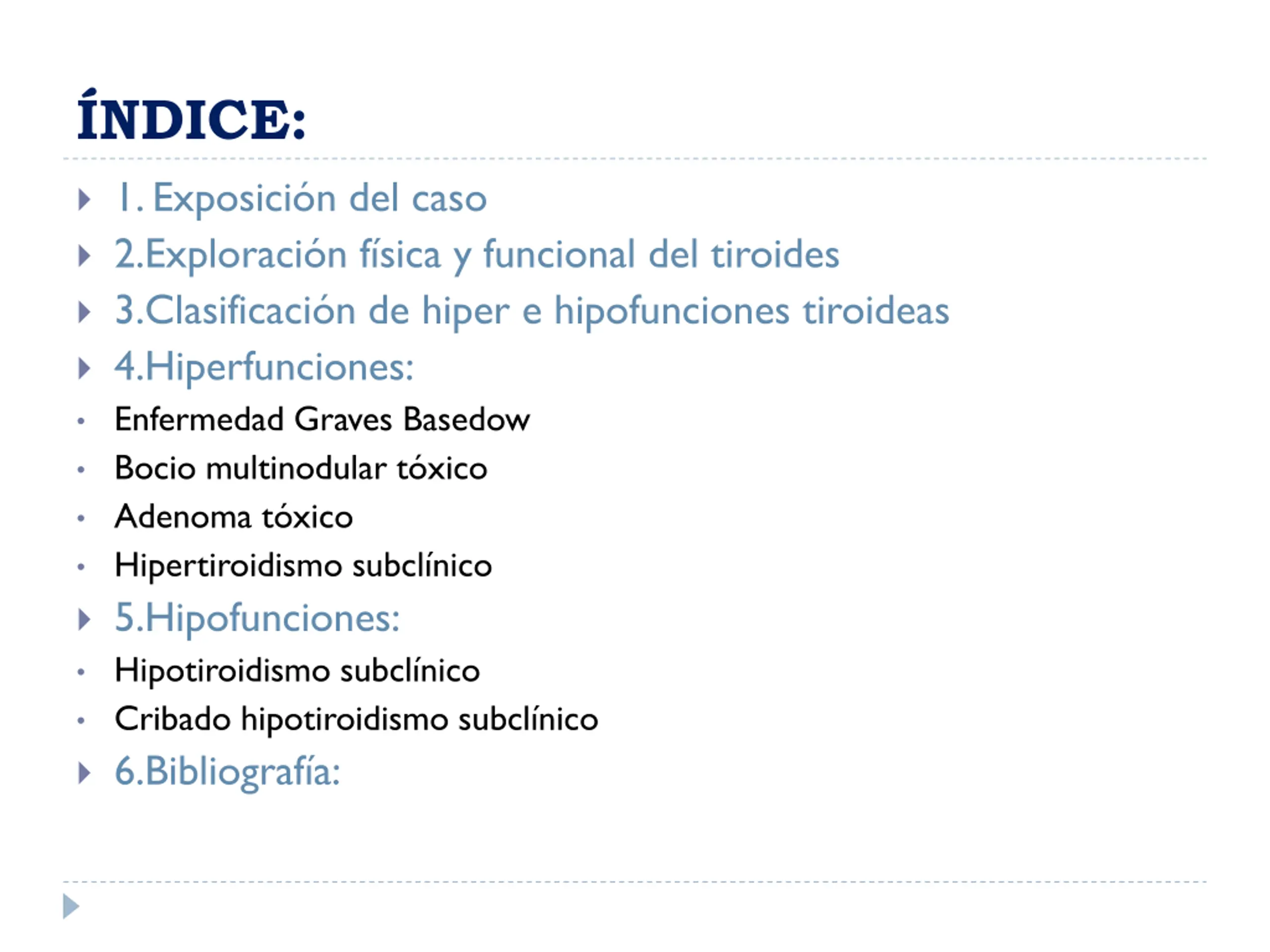 NDICE: 1. Exposici n del caso 2.Exploraci n f sica y funcional del tiroides 3.Clasificaci n de hiper e hipofunciones tiroideas 4.Hiperfunciones: Enfermedad Graves Basedow Bocio multinodular t xico Adenoma t xico Hipertiroidismo subcl nico 5.Hipofunciones: Hipotiroidismo subcl nico Cribado hipotiroidismo subcl nico 6.Bibliograf a: